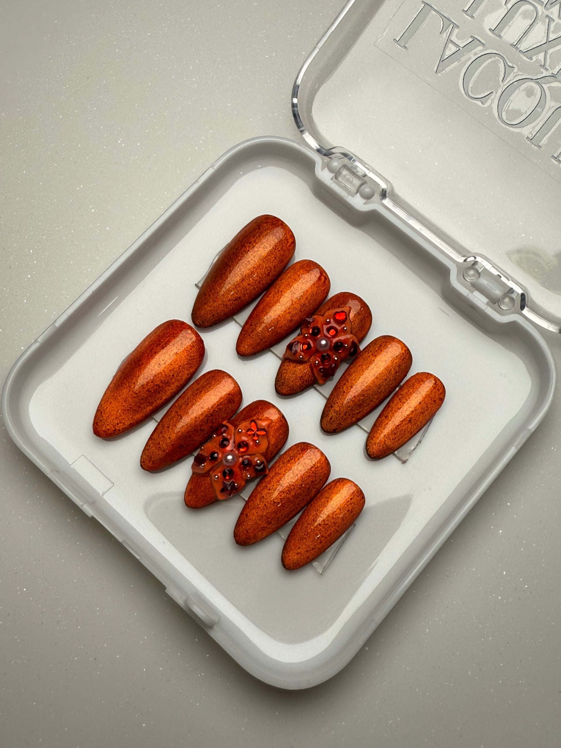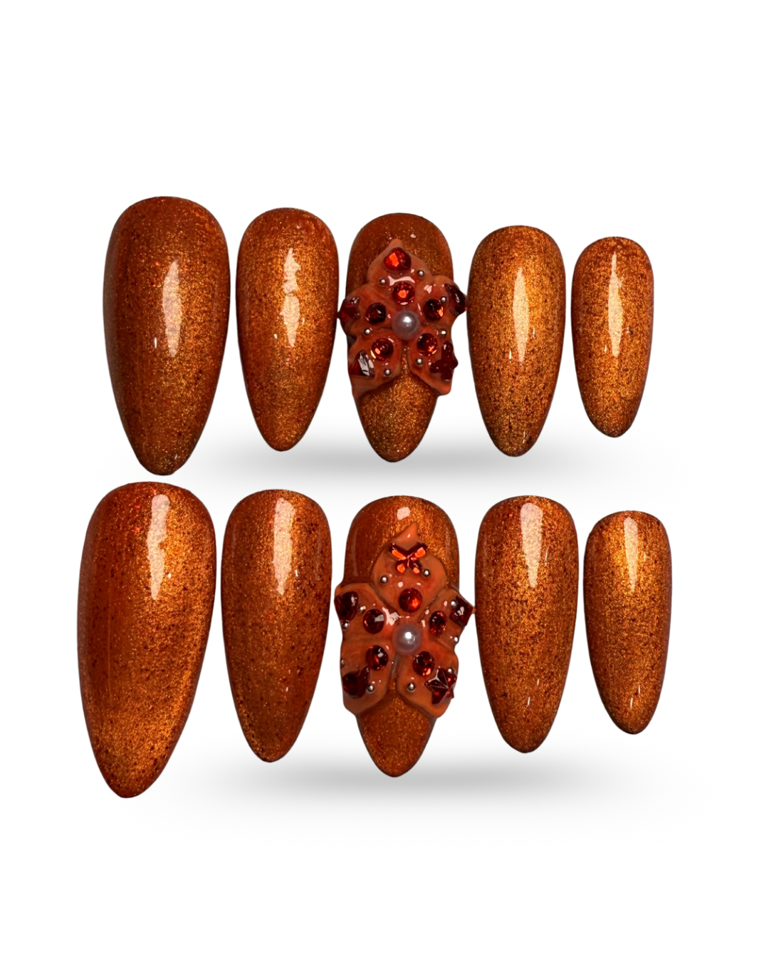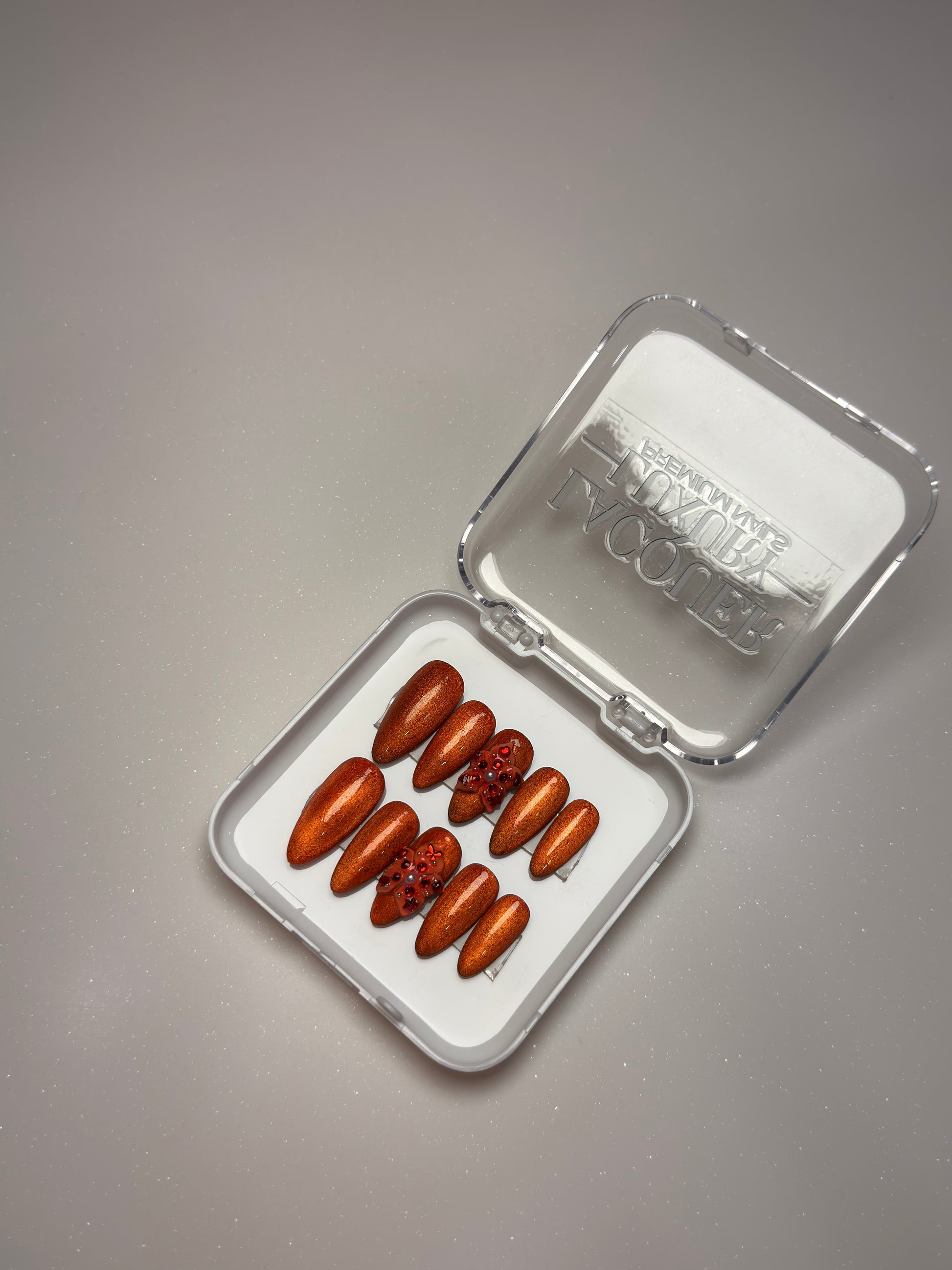 LACQUER LUXURY™️ ‘AFTER HOURS’ IS A MOLTEN COPPER SHEEN A LUMINOUS METALLIC THAT SHIFTS BEAUTIFULLY WITH THE LIGHT. THE SLEEK, TAPERED SHAPE ELONGATES THE FINGERS, WHILE TWO ACCENT NAILS ARE ELEVATED WITH RUBY CRYSTAL CLUSTERS AND SOFT PEARL DETAILS FOR A RICH, JEWEL-LIKE AND RUSTY FINISH PERFECT FOR FALL. THIS SET OF DESIGNER PRESS-ON NAILS COMBINES ARTISANAL DETAIL WITH MODERN EASE. AS HANDMADE PRESS-ON NAILS, EACH PIECE IS SHAPED FOR A SECURE, COMFORTABLE FIT WHILE OFFERING THE DURABILITY EXPECTED FROM PREMIUM PRESS-ON NAILS. FOR THOSE SEEKING LUXURY PRESS-ON NAILS ONLINE, AFTER HOURS STANDS OUT AS ONE OF THE BEST PRESS-ON NAILS, BRINGING COUTURE-INSPIRED ARTISTRY TO EVERY LOOK.
