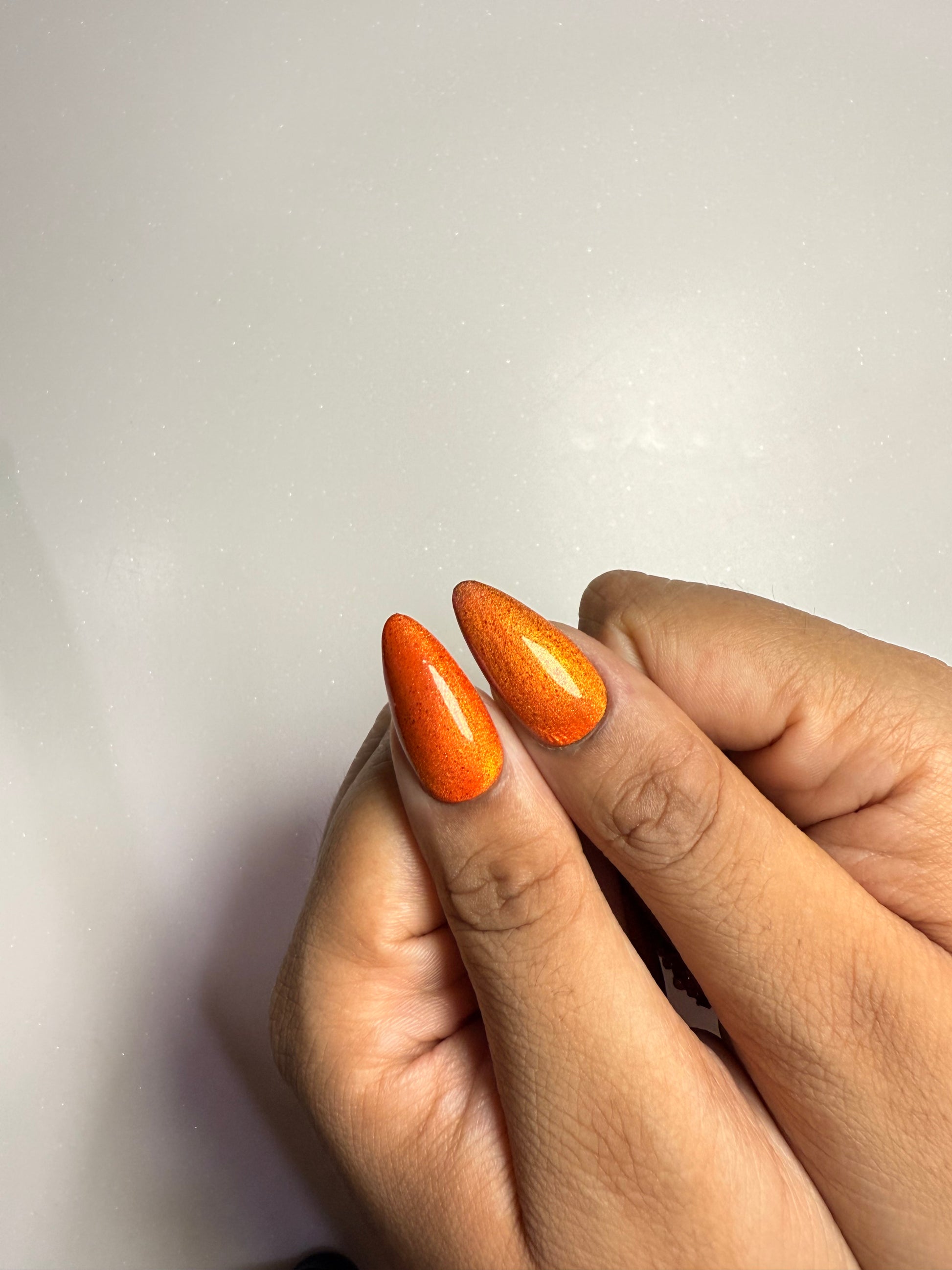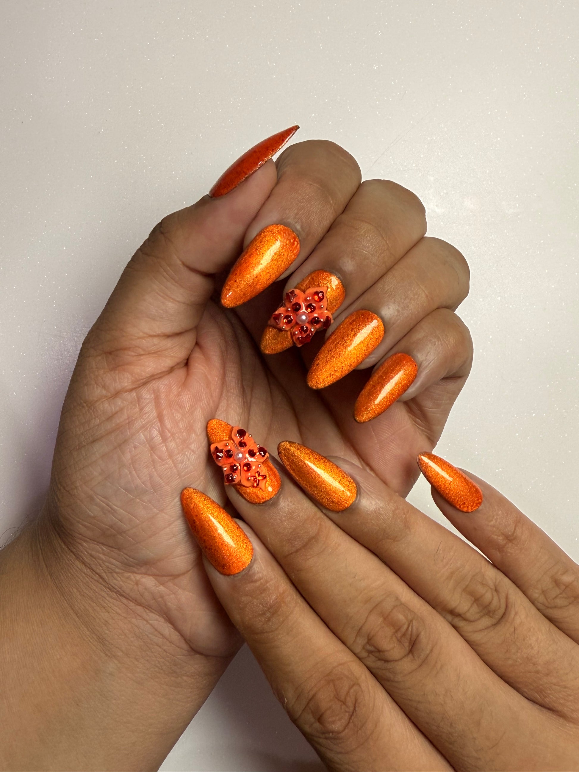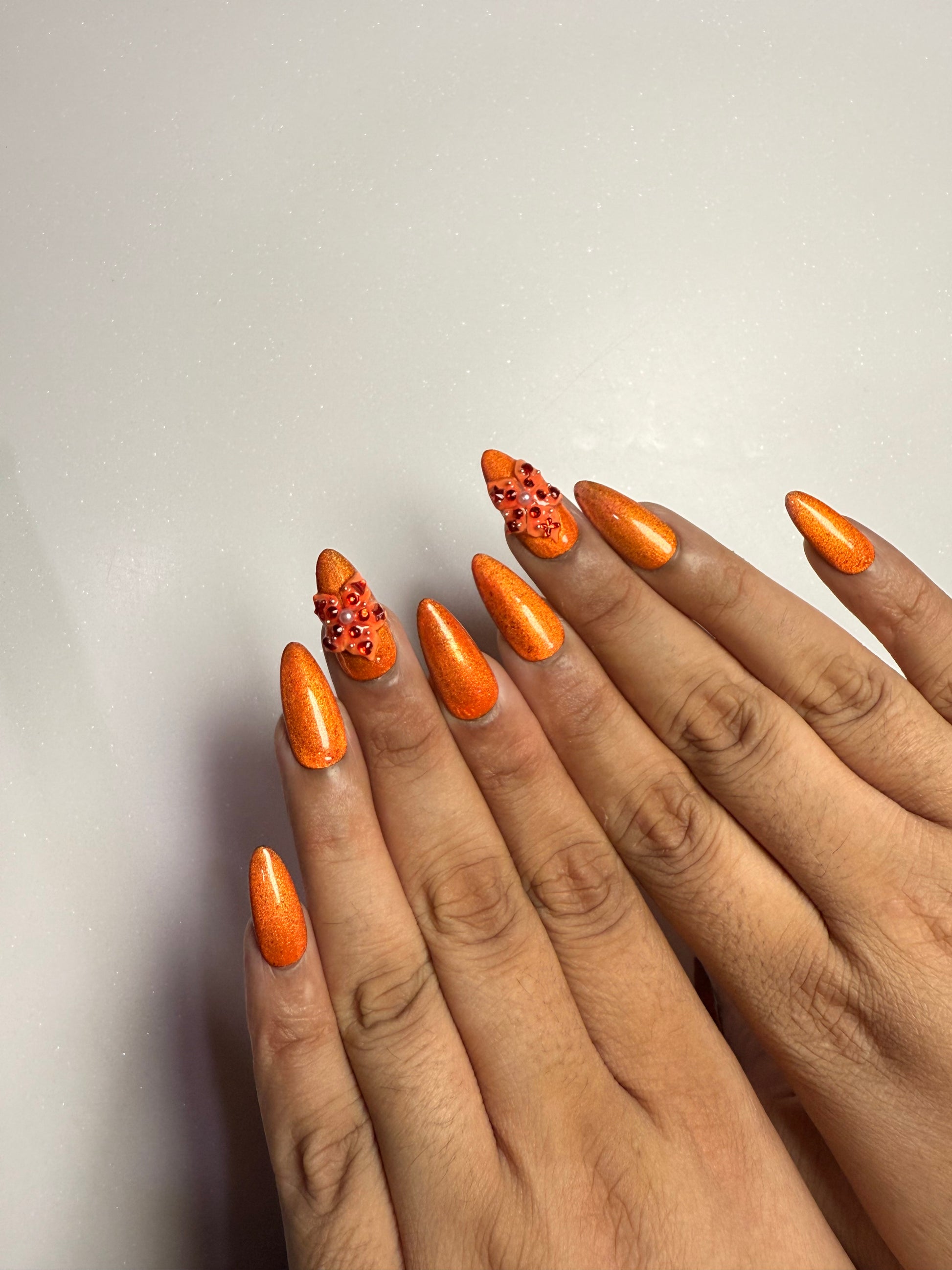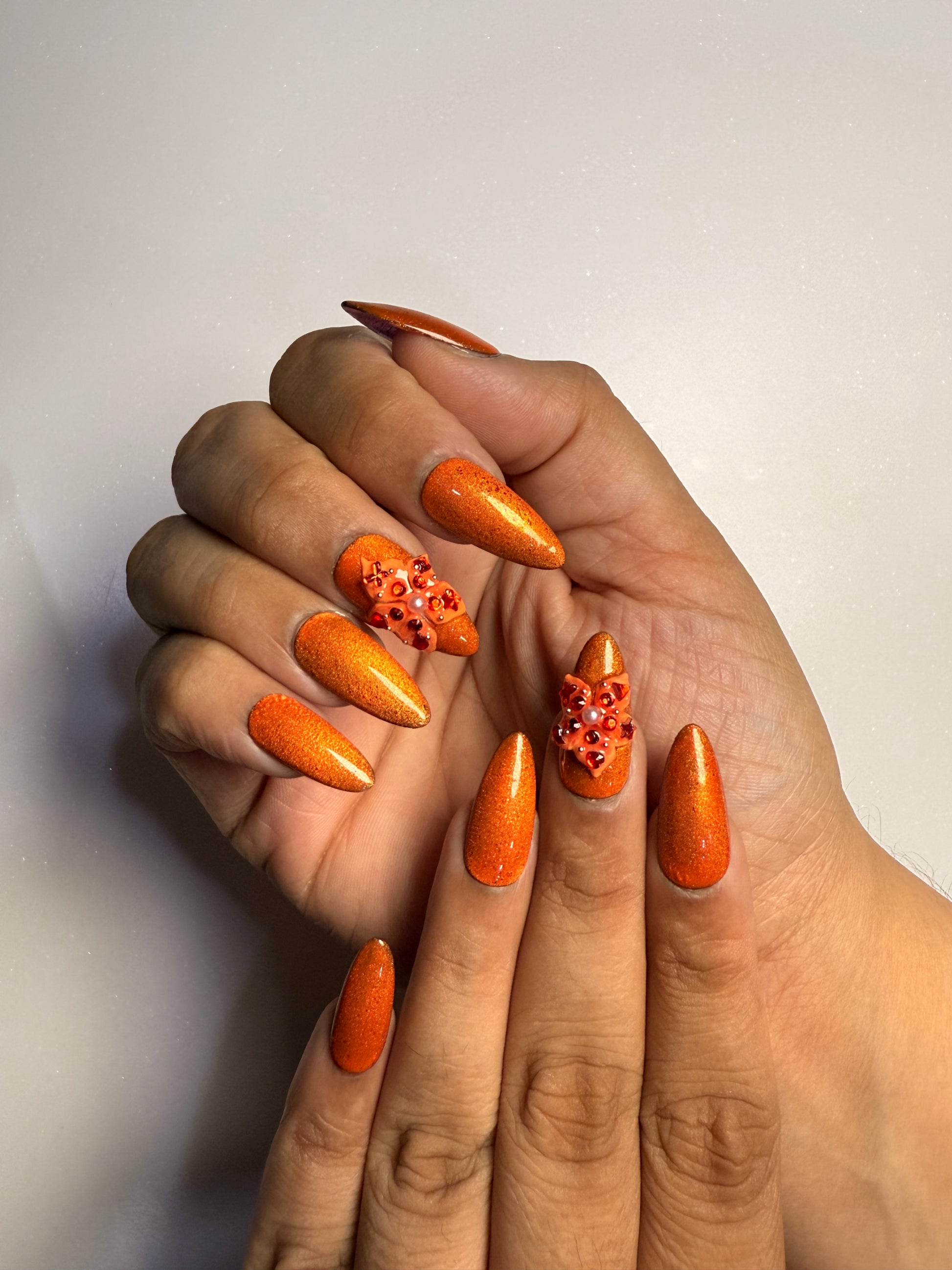LACQUER LUXURY™️ ‘AFTER HOURS’ IS A MOLTEN COPPER SHEEN A LUMINOUS METALLIC THAT SHIFTS BEAUTIFULLY WITH THE LIGHT. THE SLEEK, TAPERED SHAPE ELONGATES THE FINGERS, WHILE TWO ACCENT NAILS ARE ELEVATED WITH RUBY CRYSTAL CLUSTERS AND SOFT PEARL DETAILS FOR A RICH, JEWEL-LIKE AND RUSTY FINISH PERFECT FOR FALL. THIS SET OF DESIGNER PRESS-ON NAILS COMBINES ARTISANAL DETAIL WITH MODERN EASE. AS HANDMADE PRESS-ON NAILS, EACH PIECE IS SHAPED FOR A SECURE, COMFORTABLE FIT WHILE OFFERING THE DURABILITY EXPECTED FROM PREMIUM PRESS-ON NAILS. FOR THOSE SEEKING LUXURY PRESS-ON NAILS ONLINE, AFTER HOURS STANDS OUT AS ONE OF THE BEST PRESS-ON NAILS, BRINGING COUTURE-INSPIRED ARTISTRY TO EVERY LOOK.