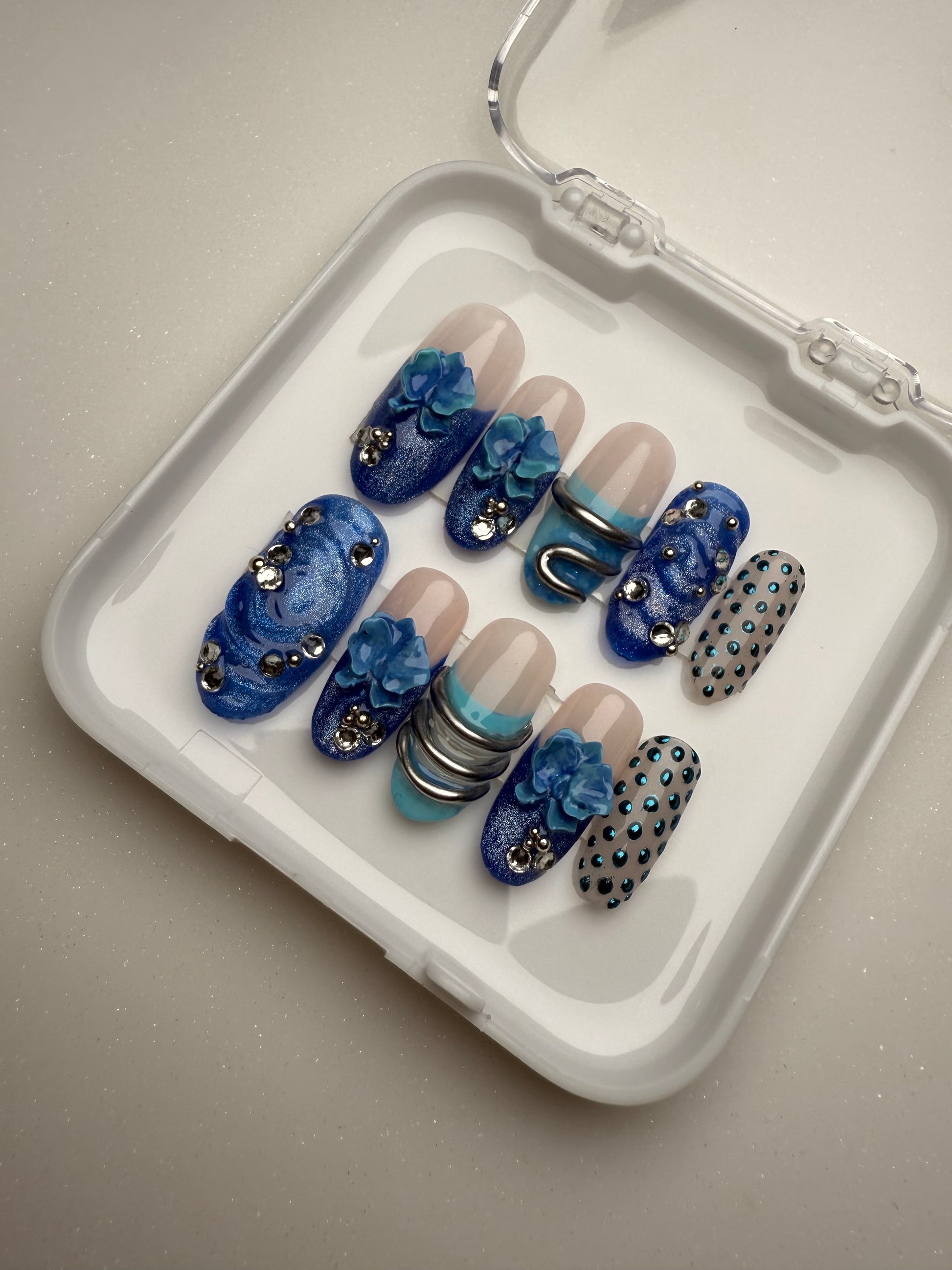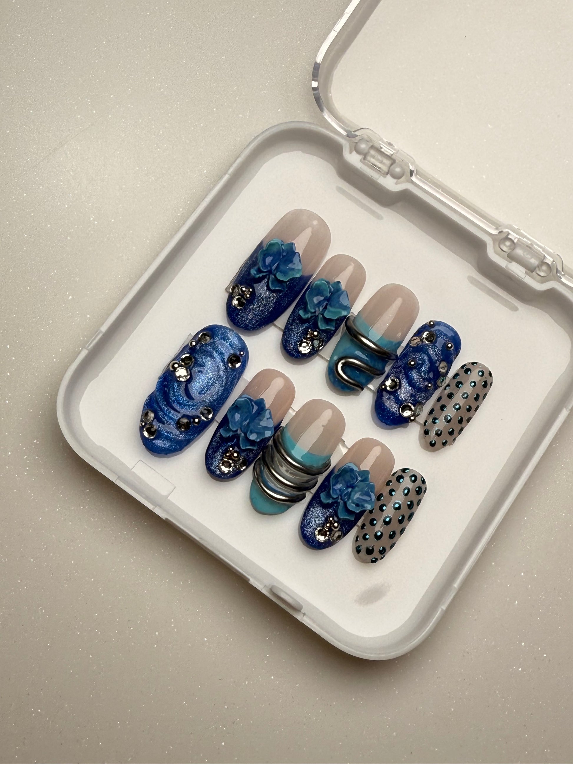 Made as premium press-ons, Blue Shift highlights handmade detailing, chrome elements, and a polished blue palette that works for both everyday styling and standout looks.