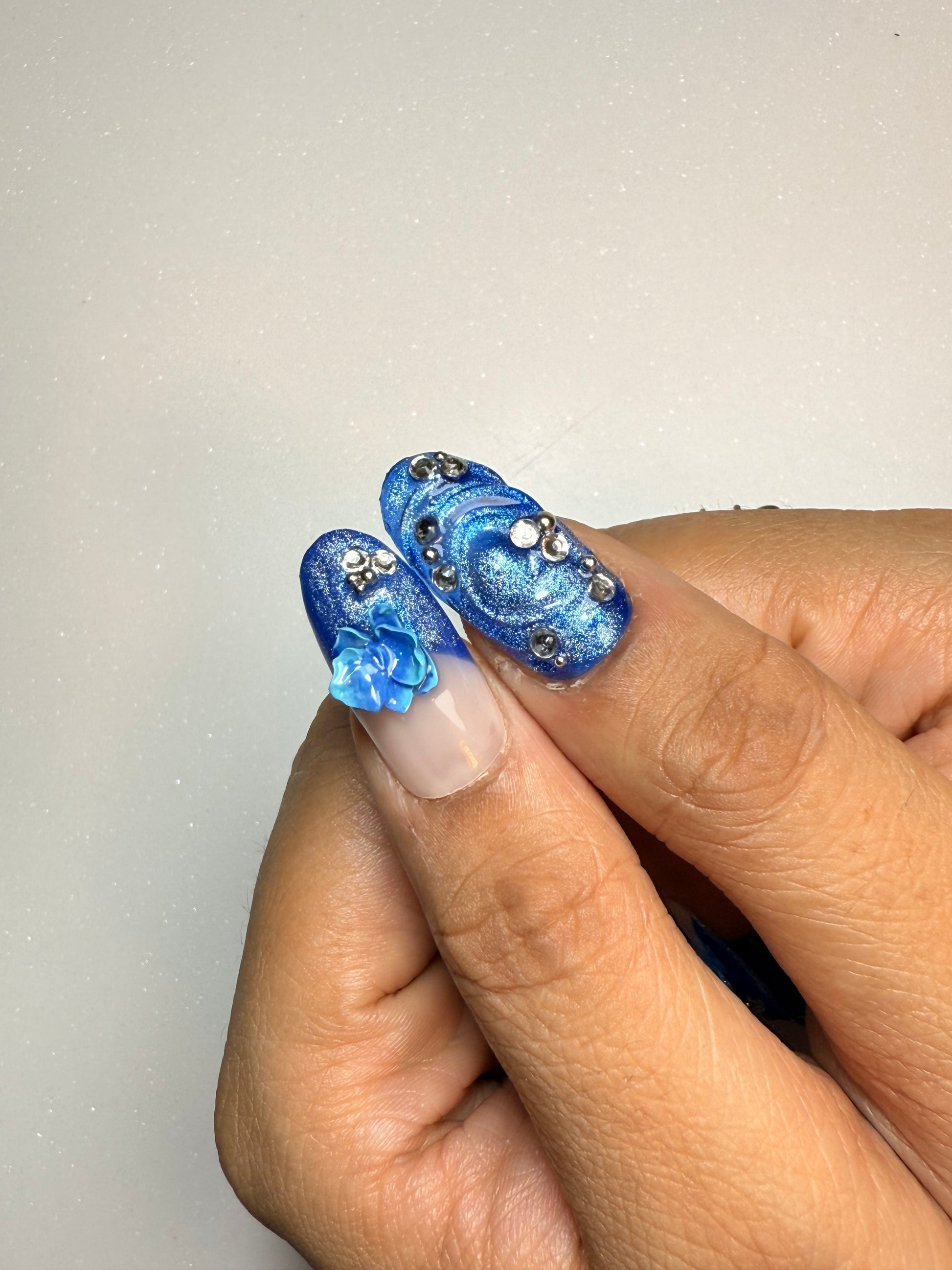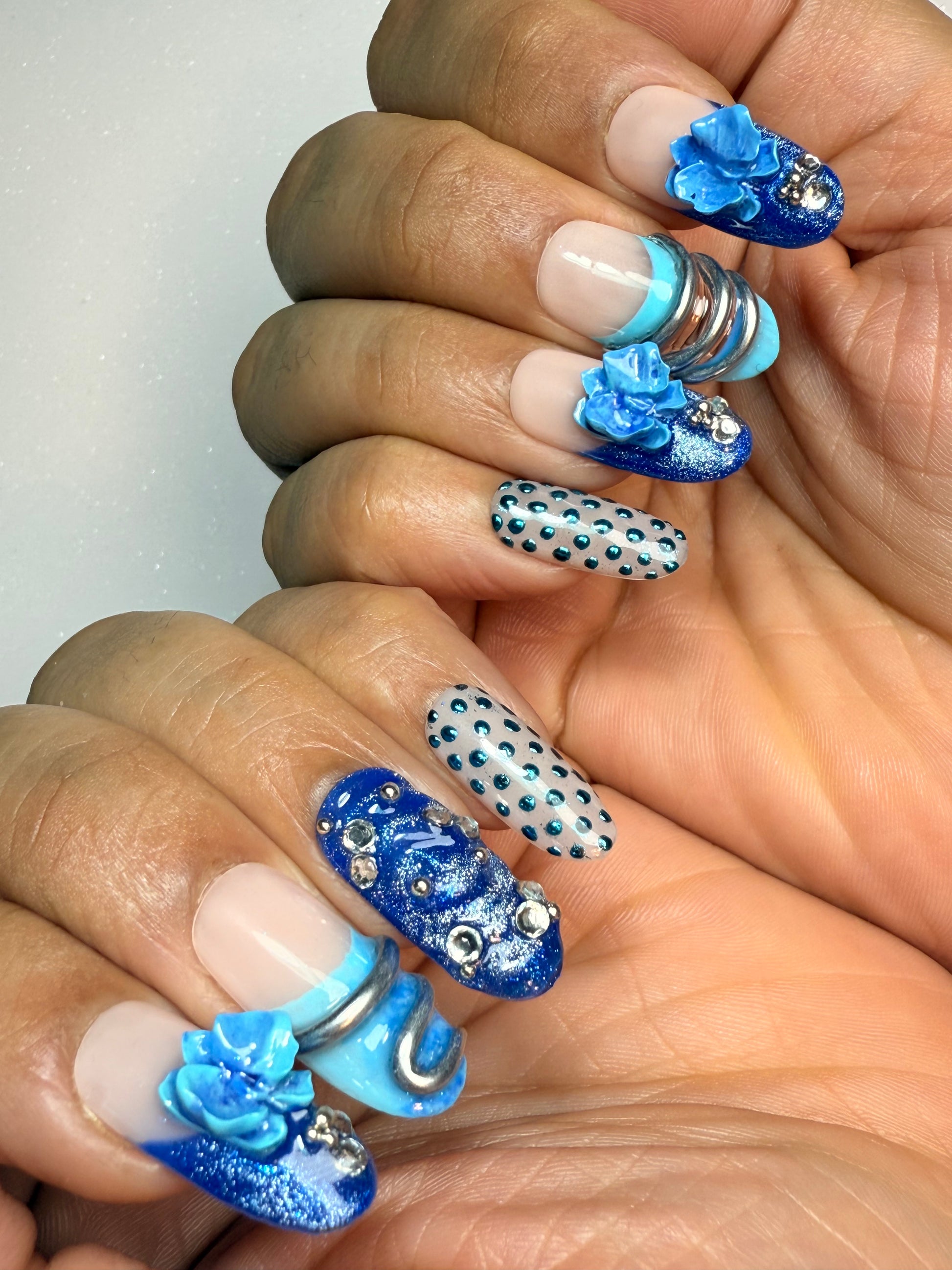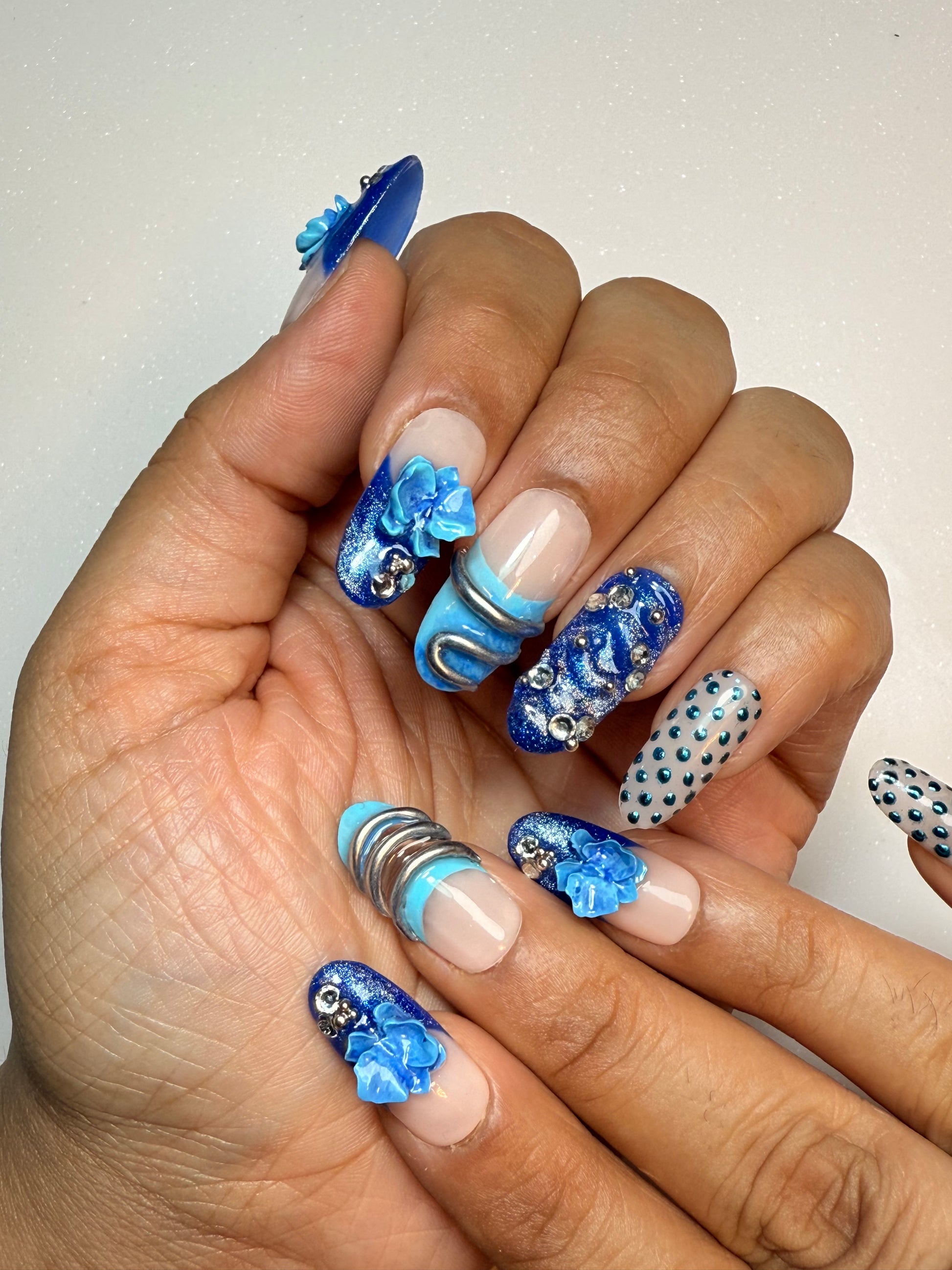 Blue Shift is built around cool, saturated blues paired with soft nude bases, creating a clean contrast. The set combines different textures you can actually see chrome rings, glossy beads, metallic accents, and layered 3D Orchid florals giving each nail its own moment.