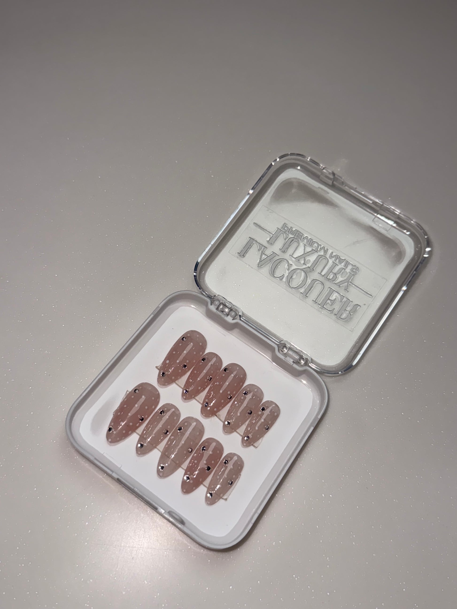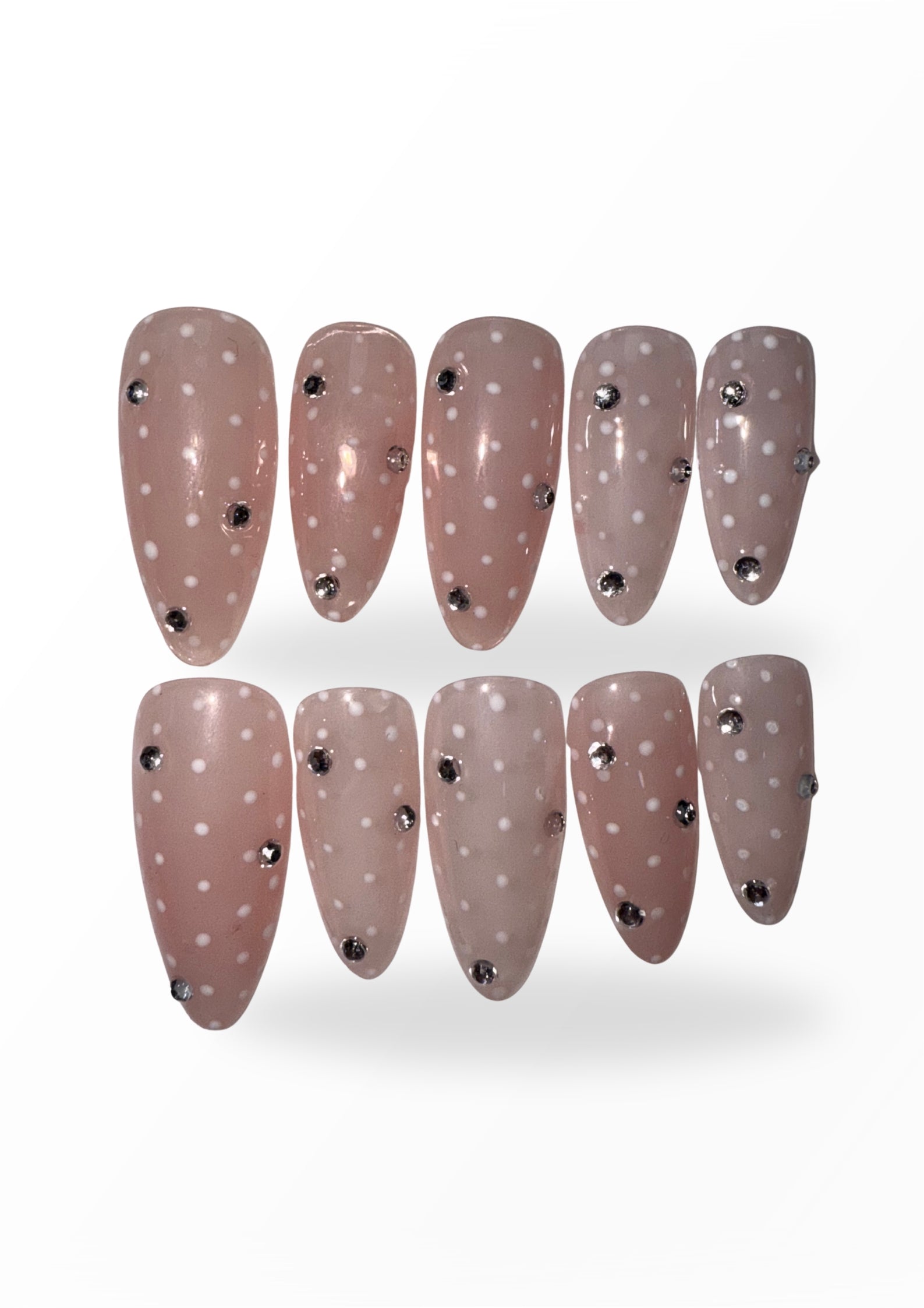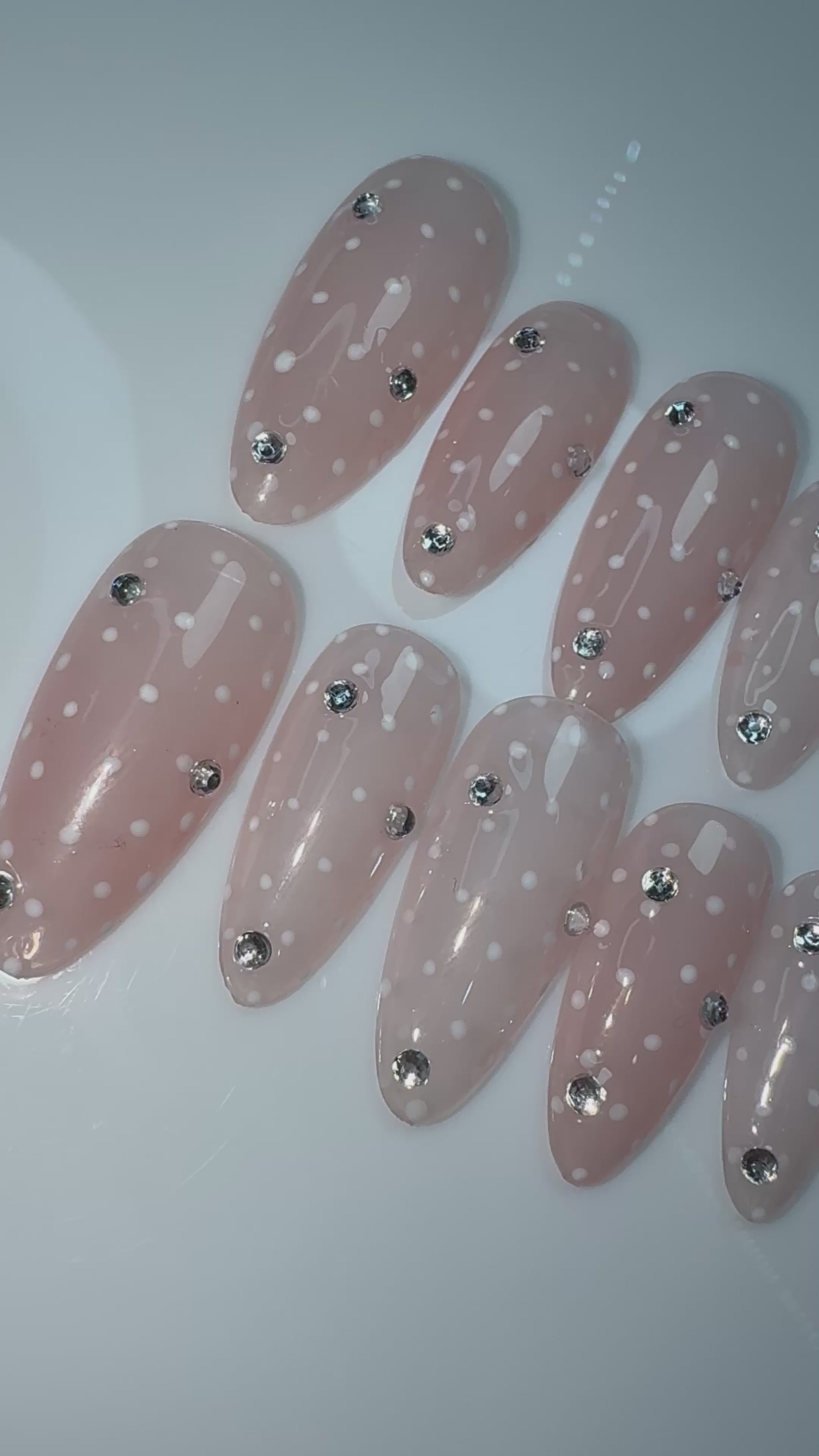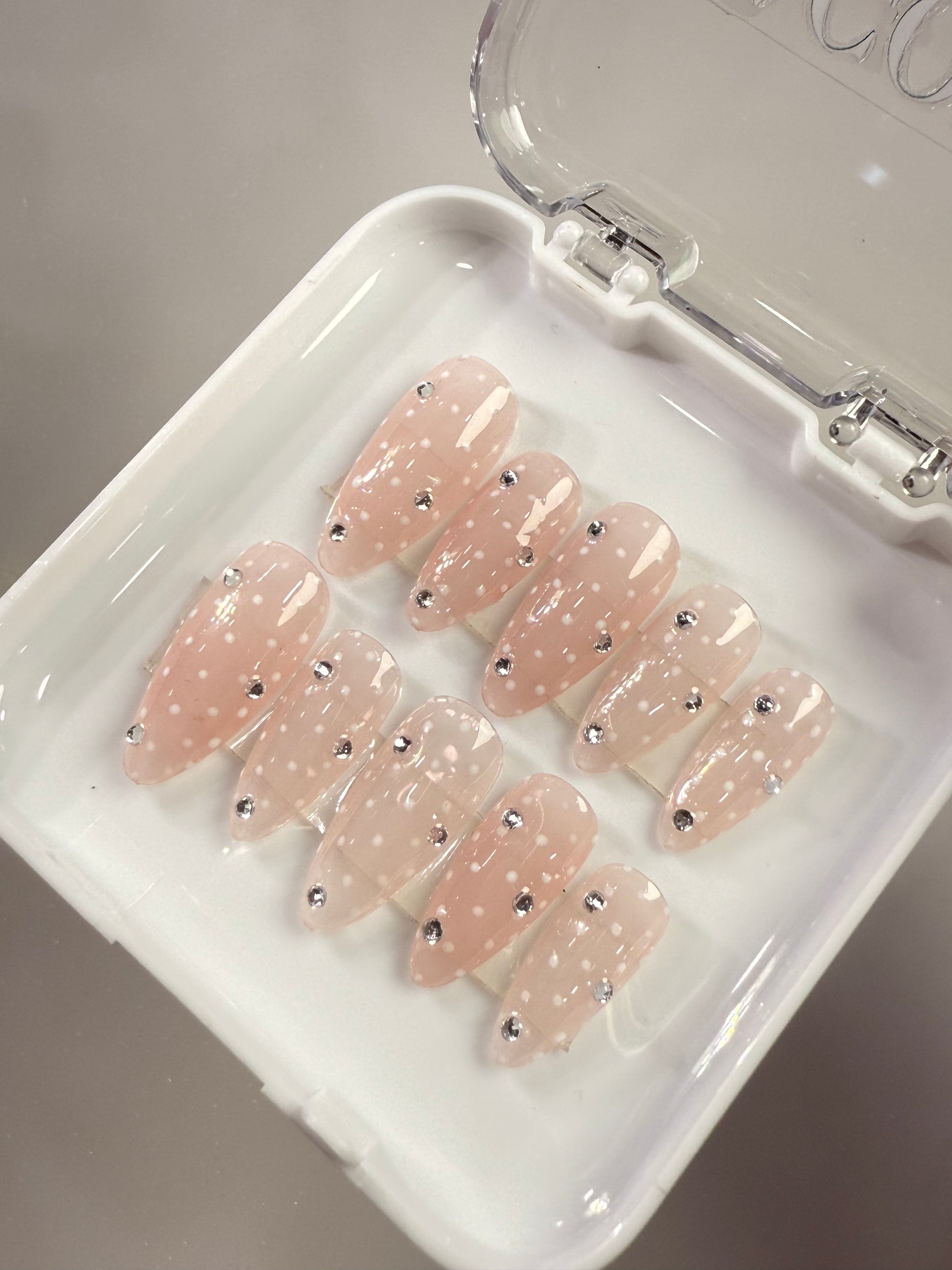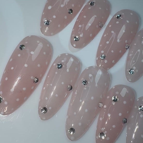 LACQUER LIXURY™️ ‘HALO SILK’ WHISPERING ELEGANCE AND EFFORTLESS CHARM HALO SILK, IS THE EPITOME OF SOFT LUXURY. THESE ALMOND-SHAPED PRESS-ON NAILS FEATURE A SHEER BLUSH-PINK BASE DELICATELY ADORNED WITH DAINTY WHITE POLKA DOTS, REMINISCENT OF PARISIAN LACE. EACH NAIL IS THOUGHTFULLY ACCENTED WITH SUBTLE CRYSTAL RHINESTONES THAT CATCH THE LIGHT WITH EVERY MOVEMENT—LIKE DEW ON MORNING PETALS. UNDERSTATED YET UNMISTAKABLY GLAMOROUS, THIS SET IS PERFECT FOR BRIDAL MOMENTS, HIGH-TEA SOIRÉES, OR SIMPLY EMBRACING YOUR INNER ROMANTIC WITH REFINED GRACE.