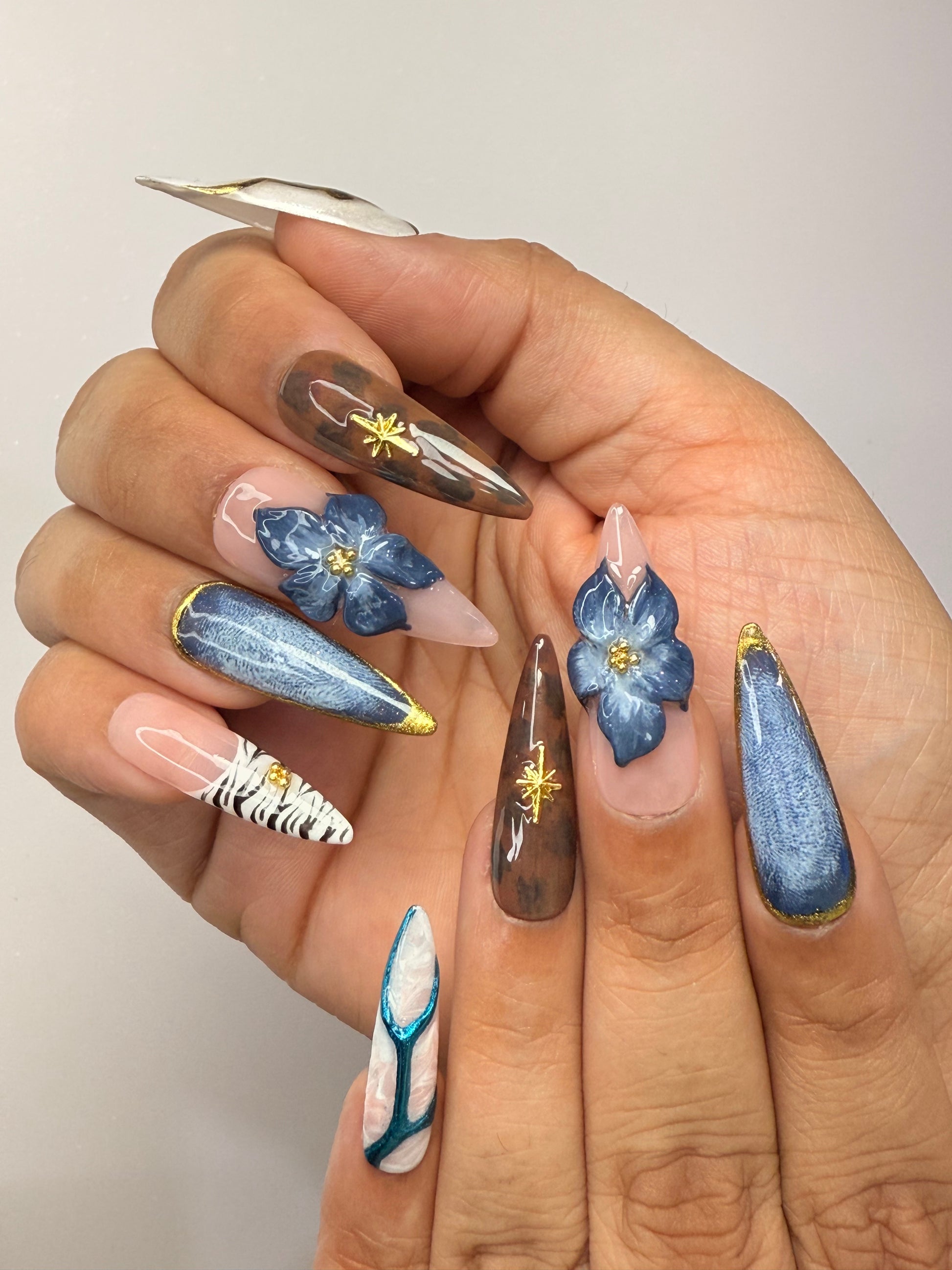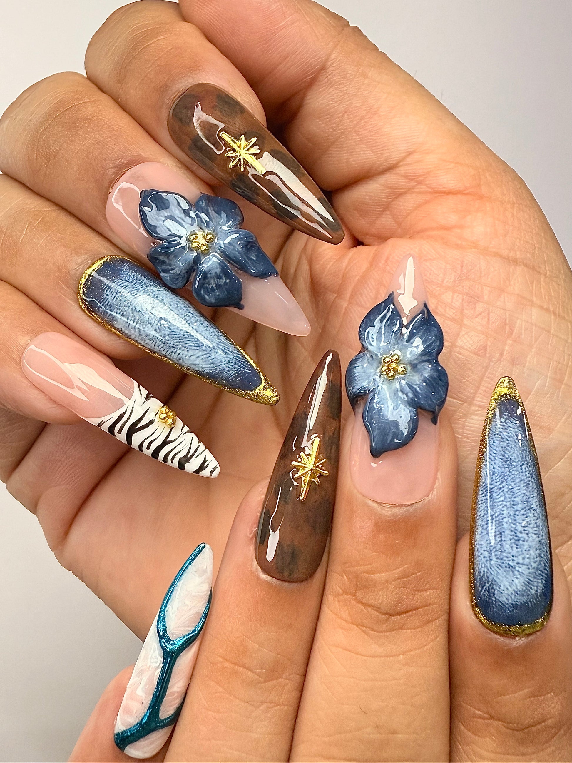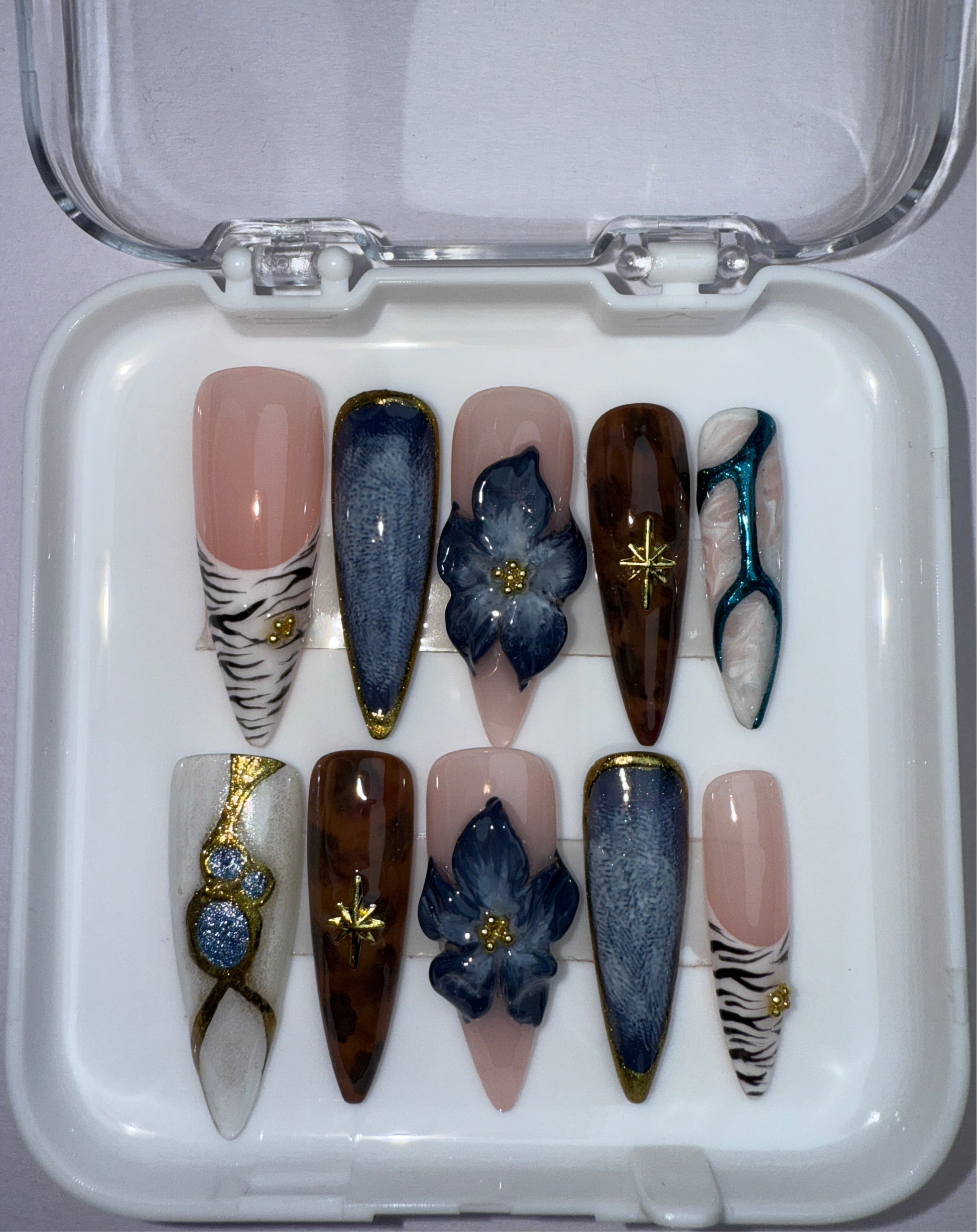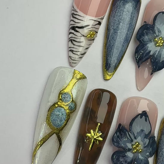 LACQUER LUXURY™️ 'MIDNIGHT SAFARI' BLENDs FIERCE STYLE WITH REFINED ARTISTRY. FEATURING STRIKING ZEBRA PRINTS, DEEP DENIM TEXTURES, TORTOISESHELL SWIRLS, AND 3D MIDNIGHT-BLUE FLORALS, EACH NAIL TELLS A STORY OF ADVENTURE AND LUXURY. GOLD ACCENTS AND STARBURST DETAILS ADD A COSMIC GLOW, WHILE MARBLE FINISHES AND GLITTERING TEXTURES BRING OUT GLAM.