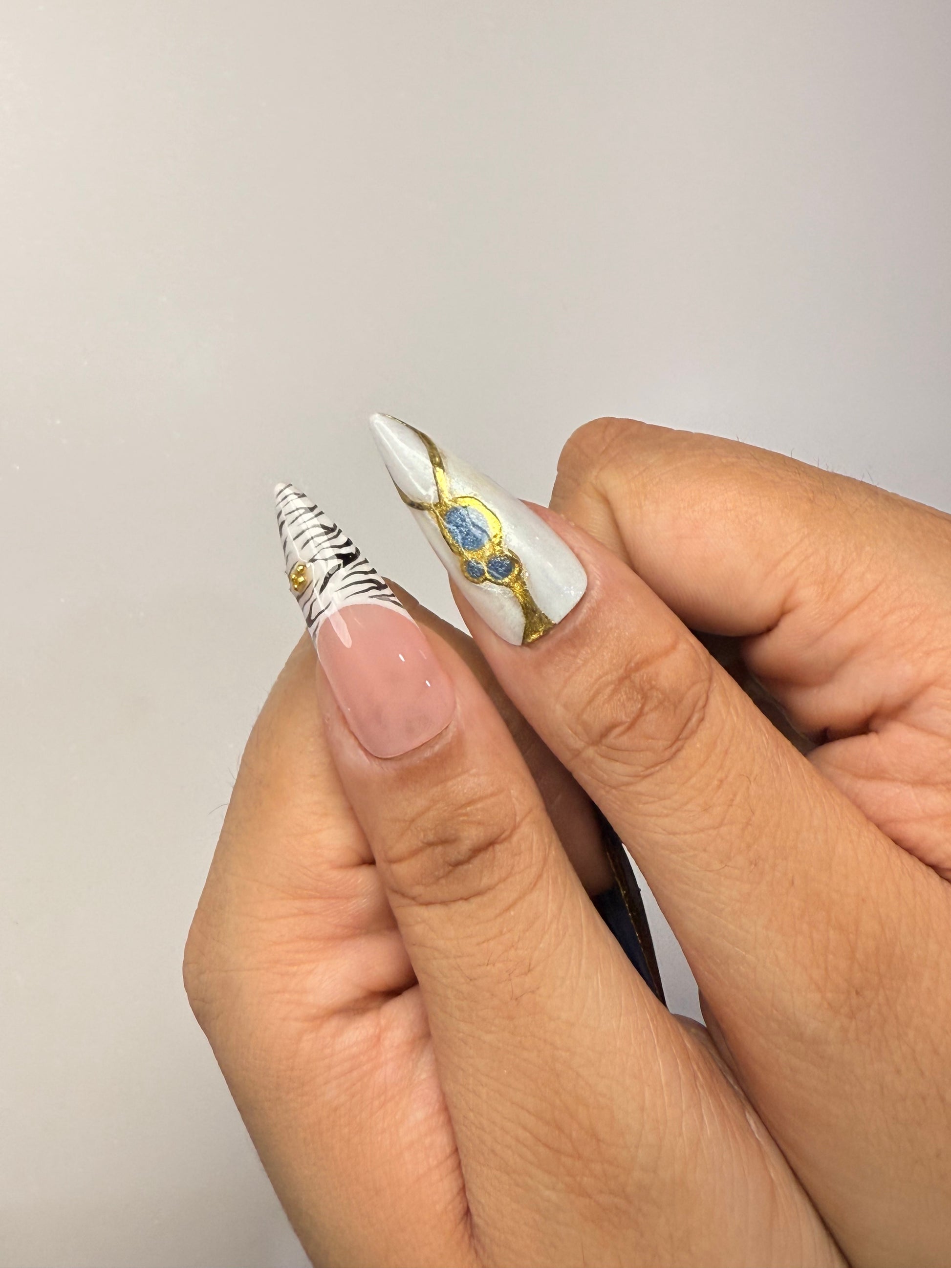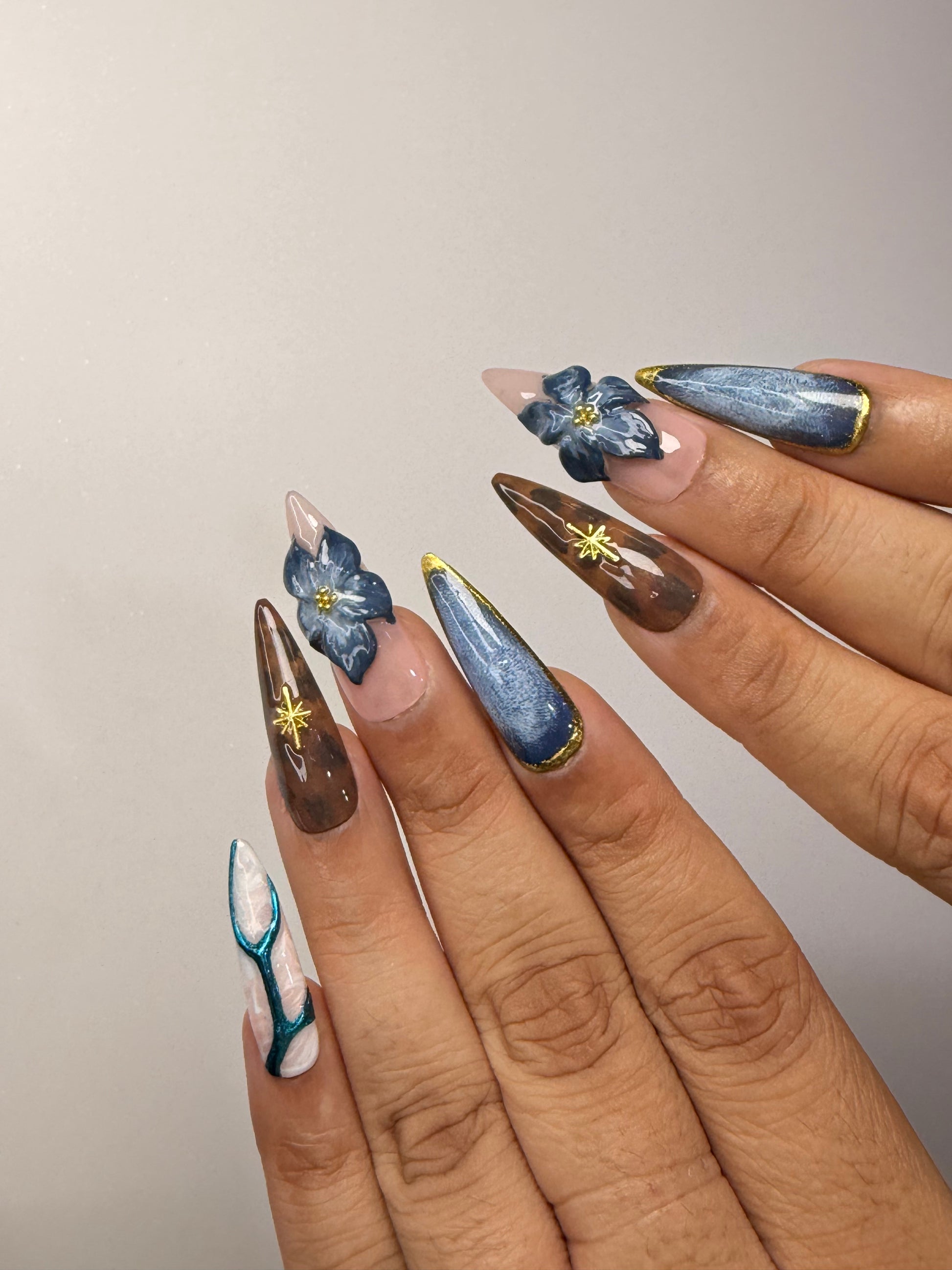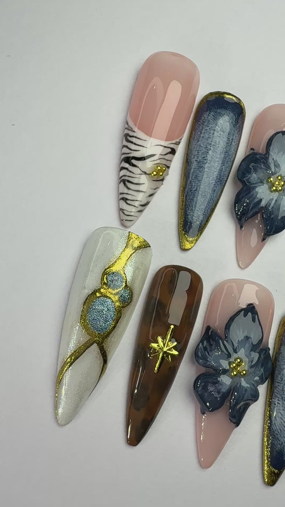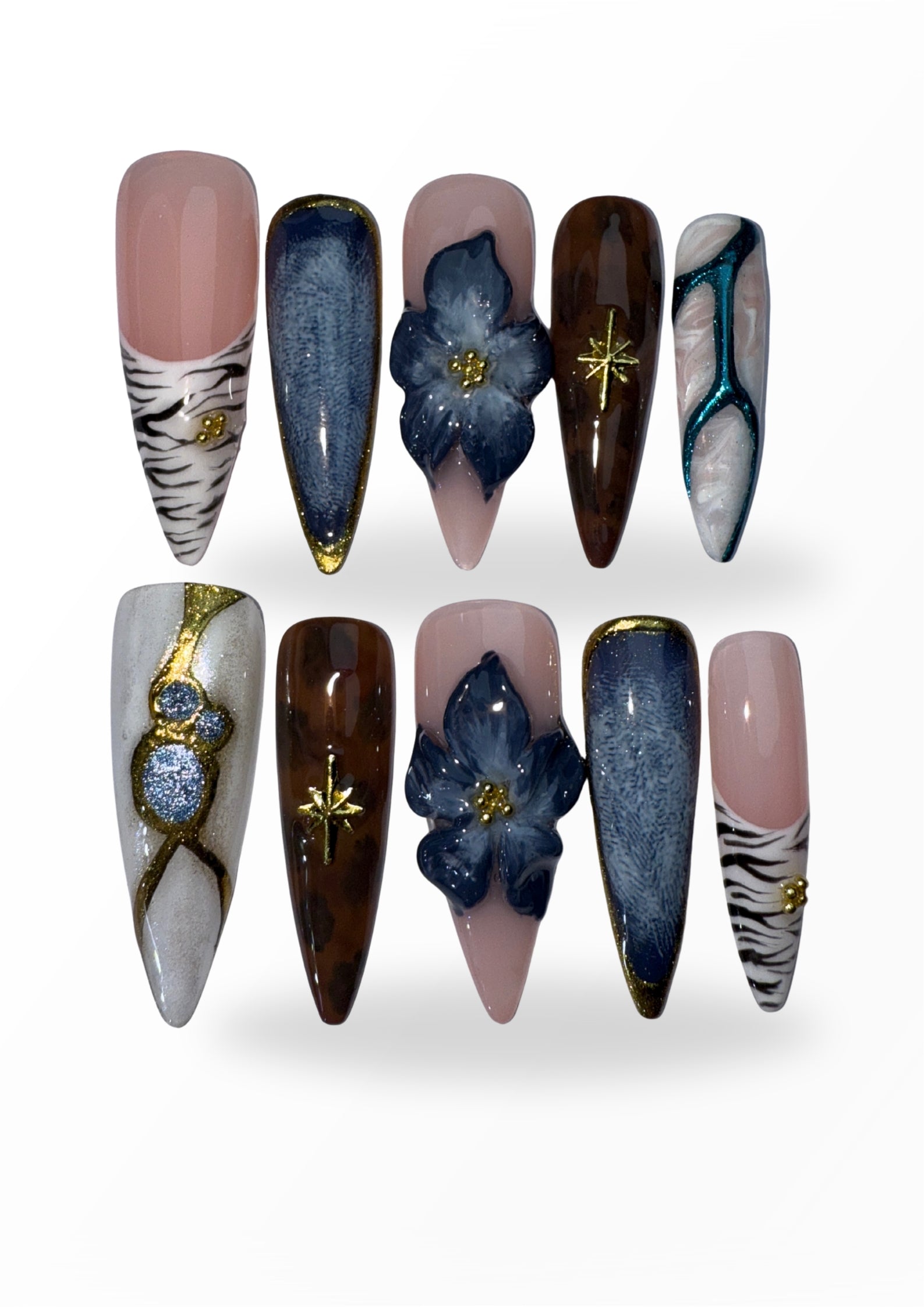 LACQUER LUXURY™️ 'MIDNIGHT SAFARI' BLENDs FIERCE STYLE WITH REFINED ARTISTRY. FEATURING STRIKING ZEBRA PRINTS, DEEP DENIM TEXTURES, TORTOISESHELL SWIRLS, AND 3D MIDNIGHT-BLUE FLORALS, EACH NAIL TELLS A STORY OF ADVENTURE AND LUXURY. GOLD ACCENTS AND STARBURST DETAILS ADD A COSMIC GLOW, WHILE MARBLE FINISHES AND GLITTERING TEXTURES BRING OUT GLAM.