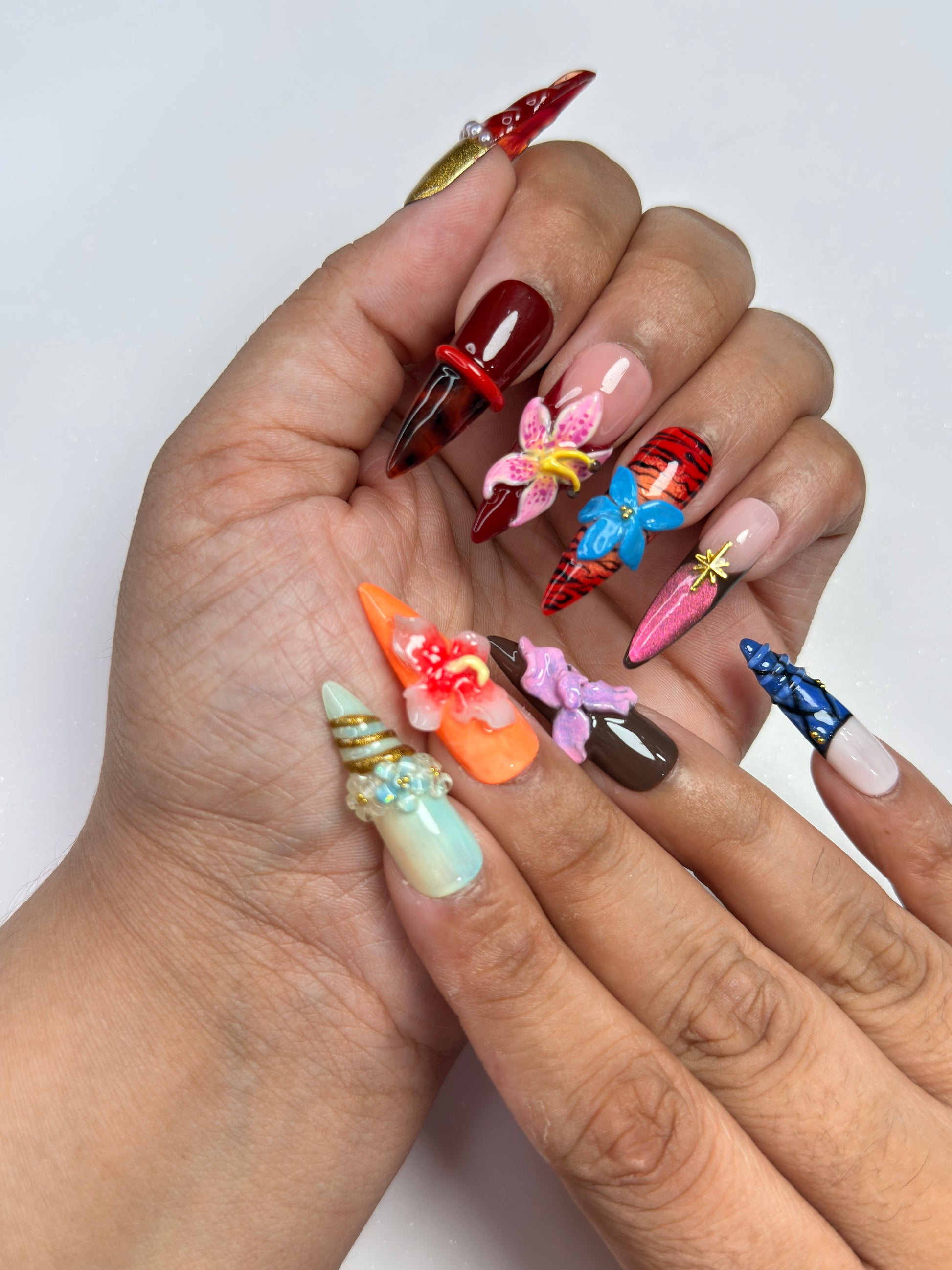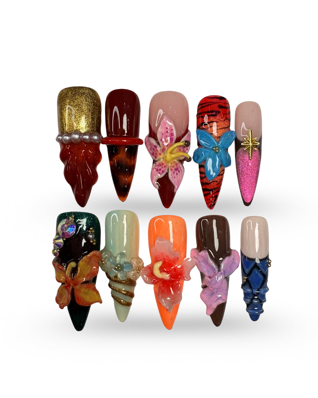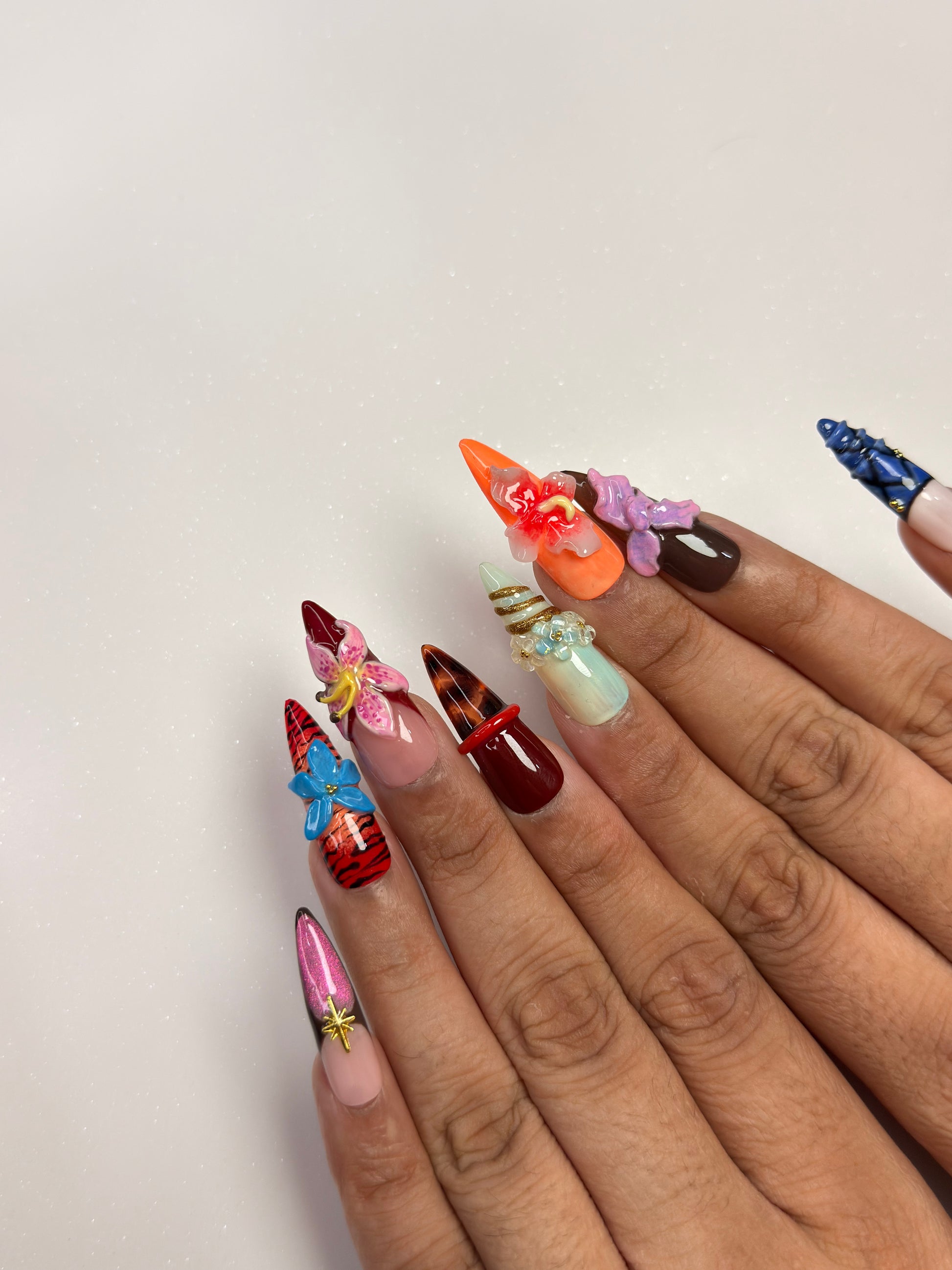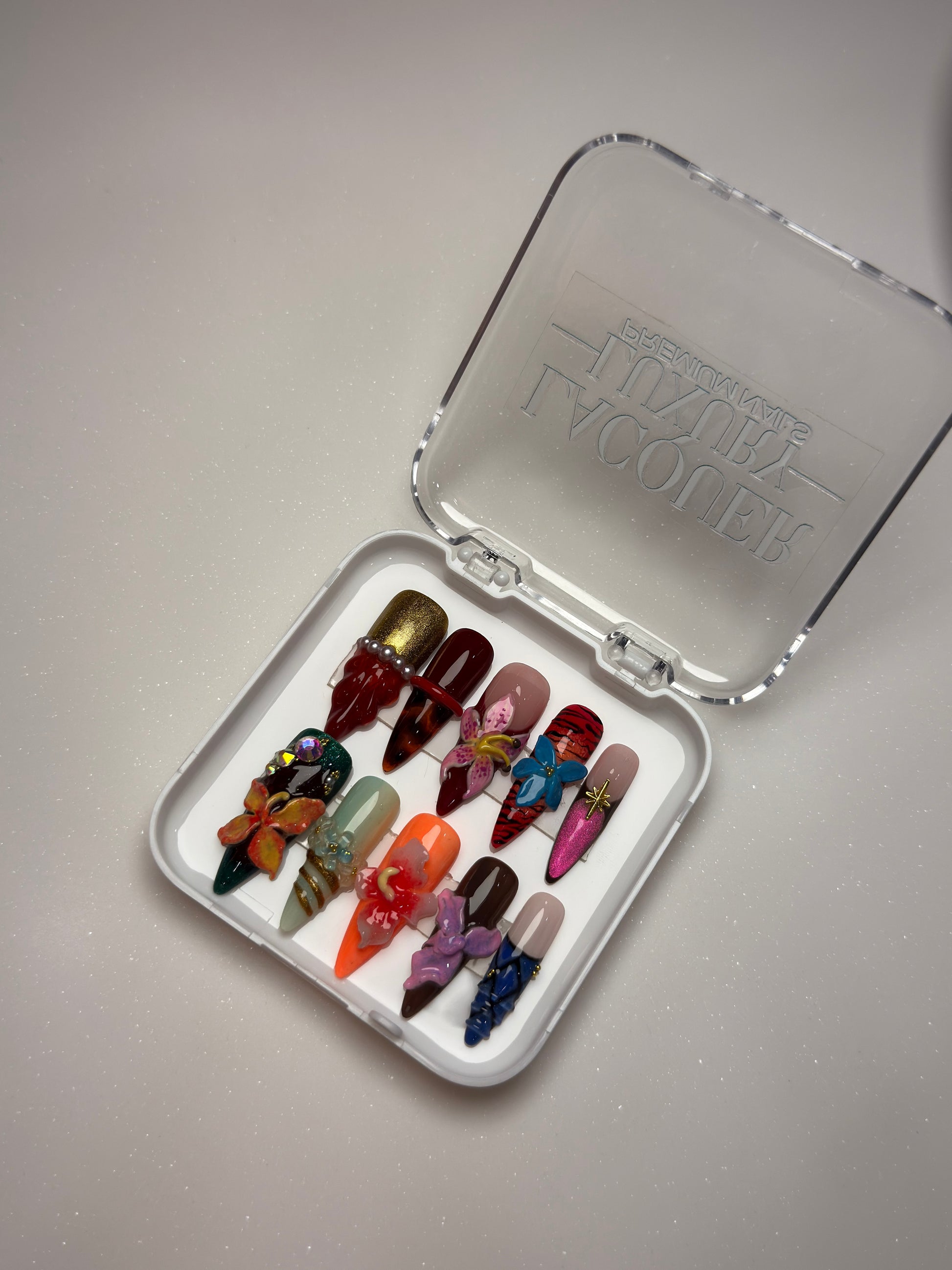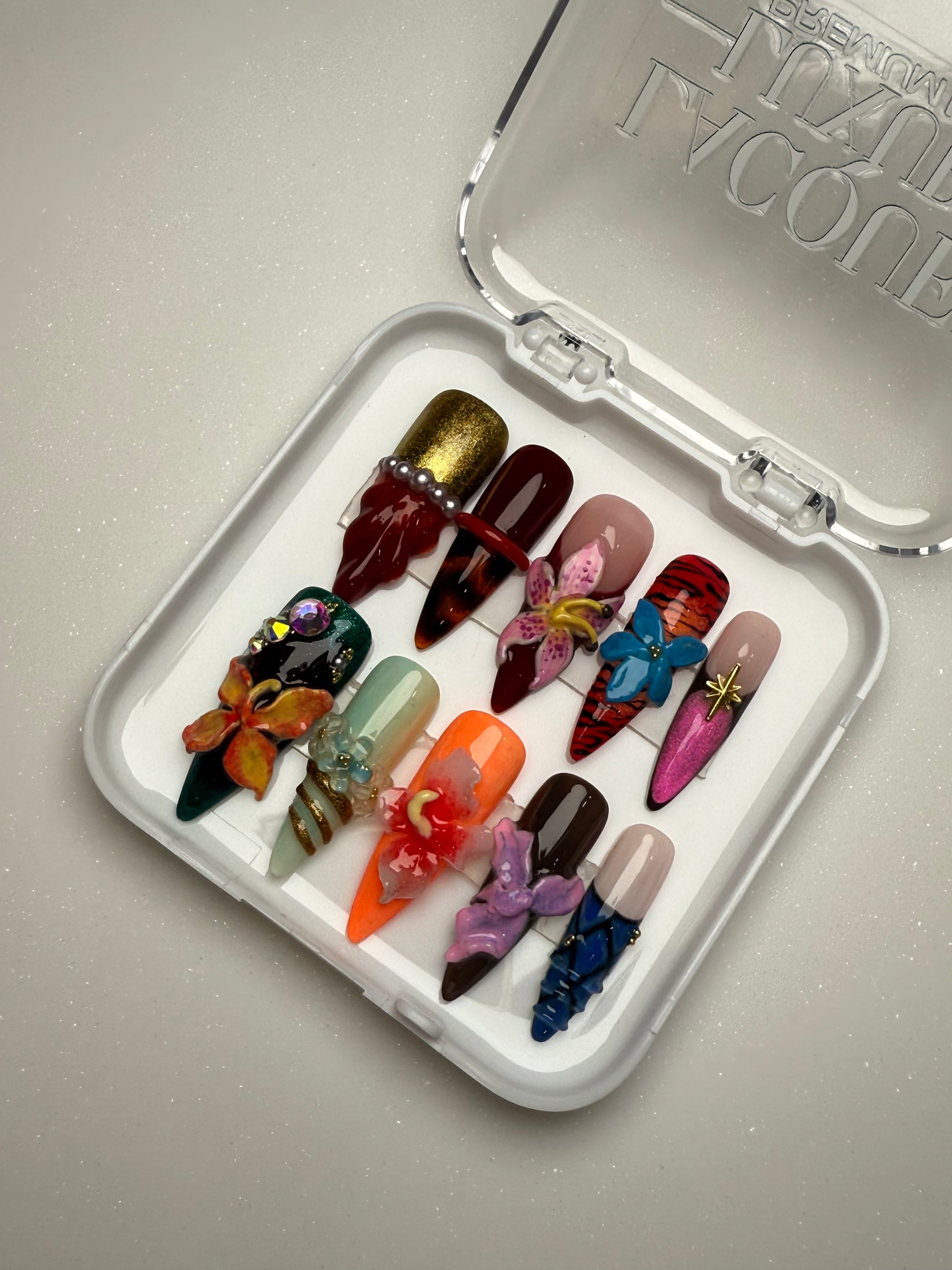 LACQUER LUXURY™️‘NATURE COUTURE’ TRANSFORMS NAILS INTO MINIATURE WORKS OF ART, MERGING ORGANIC BEAUTY WITH HIGH-FASHION DETAILING. SCULPTED 3D FLORALS, ANIMAL-PRINT ACCENTS, AND LAYERED TEXTURES COME TOGETHER IN A SET THAT CELEBRATES THE UNTAMED ELEGANCE OF NATURE ELEVATED TO COUTURE. EACH NAIL BALANCES INTRICATE HAND-APPLIED DESIGN WITH BOLD STRUCTURE, MAKING THE SET BOTH WEARABLE AND ARTFUL. CREATED AS DESIGNER PRESS-ON NAILS, THIS COLLECTION EMBODIES THE PRECISION OF HANDMADE PRESS-ON NAILS WITH A COUTURE FINISH. OFFERING THE DURABILITY AND COMFORT OF PREMIUM PRESS-ON NAILS, NATURE COUTURE IS A STATEMENT PIECE AMONG LUXURY PRESS-ON NAILS ONLINE, RANKING IT WITH THE BEST PRESS-ON NAILS FOR THOSE WHO VALUE ARTISTRY AND INDIVIDUALITY.