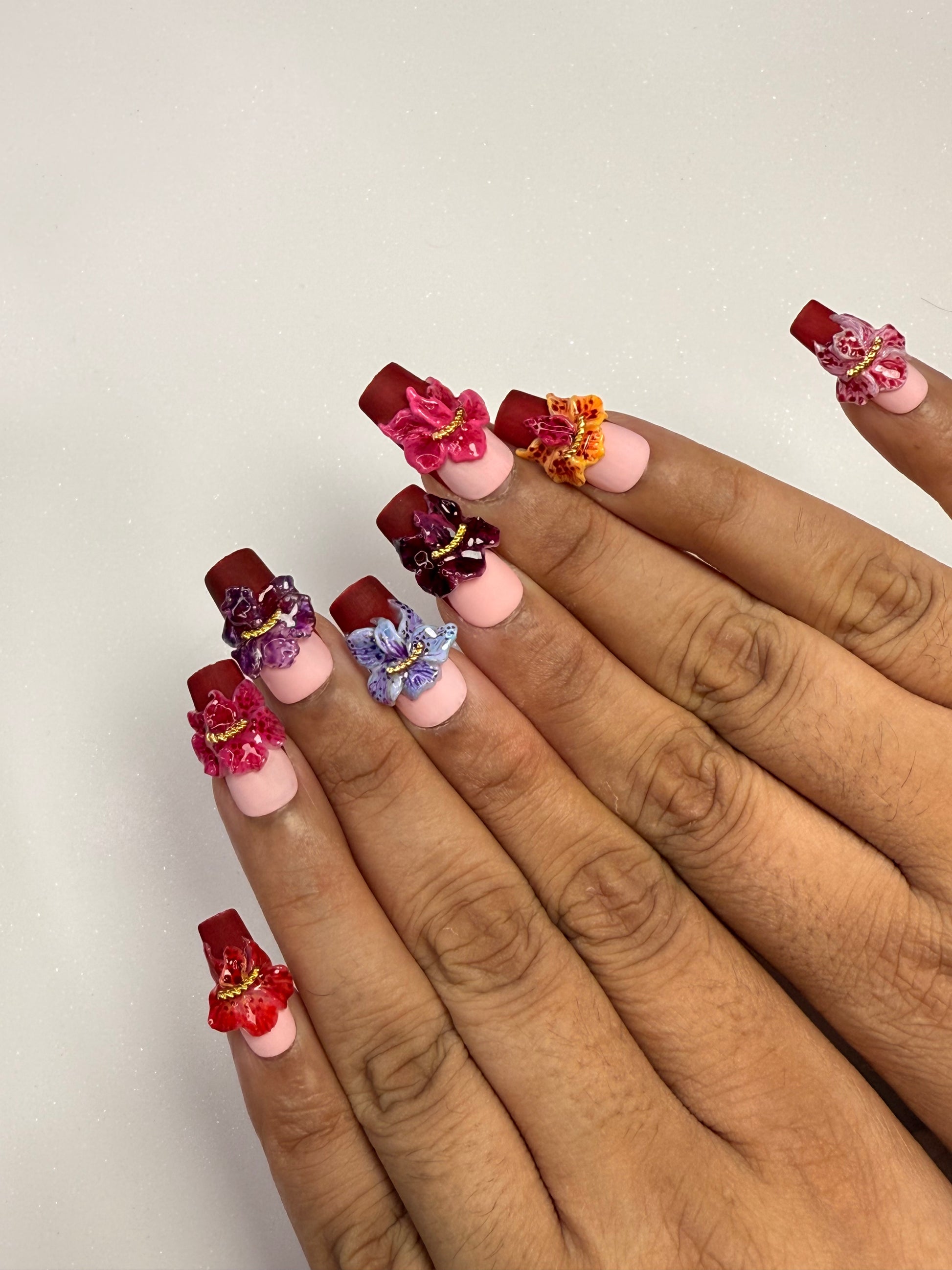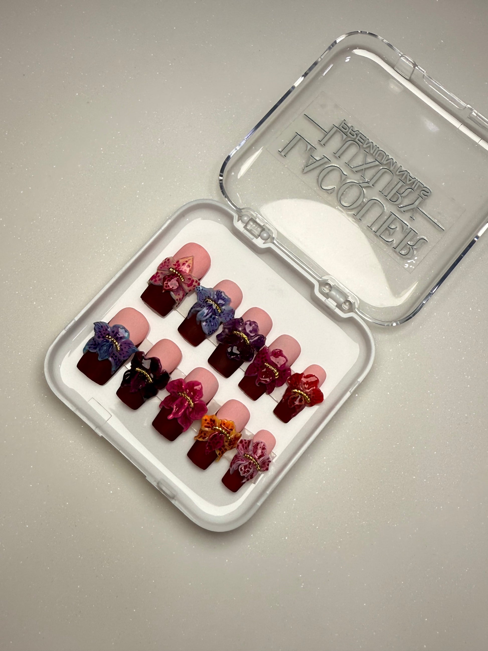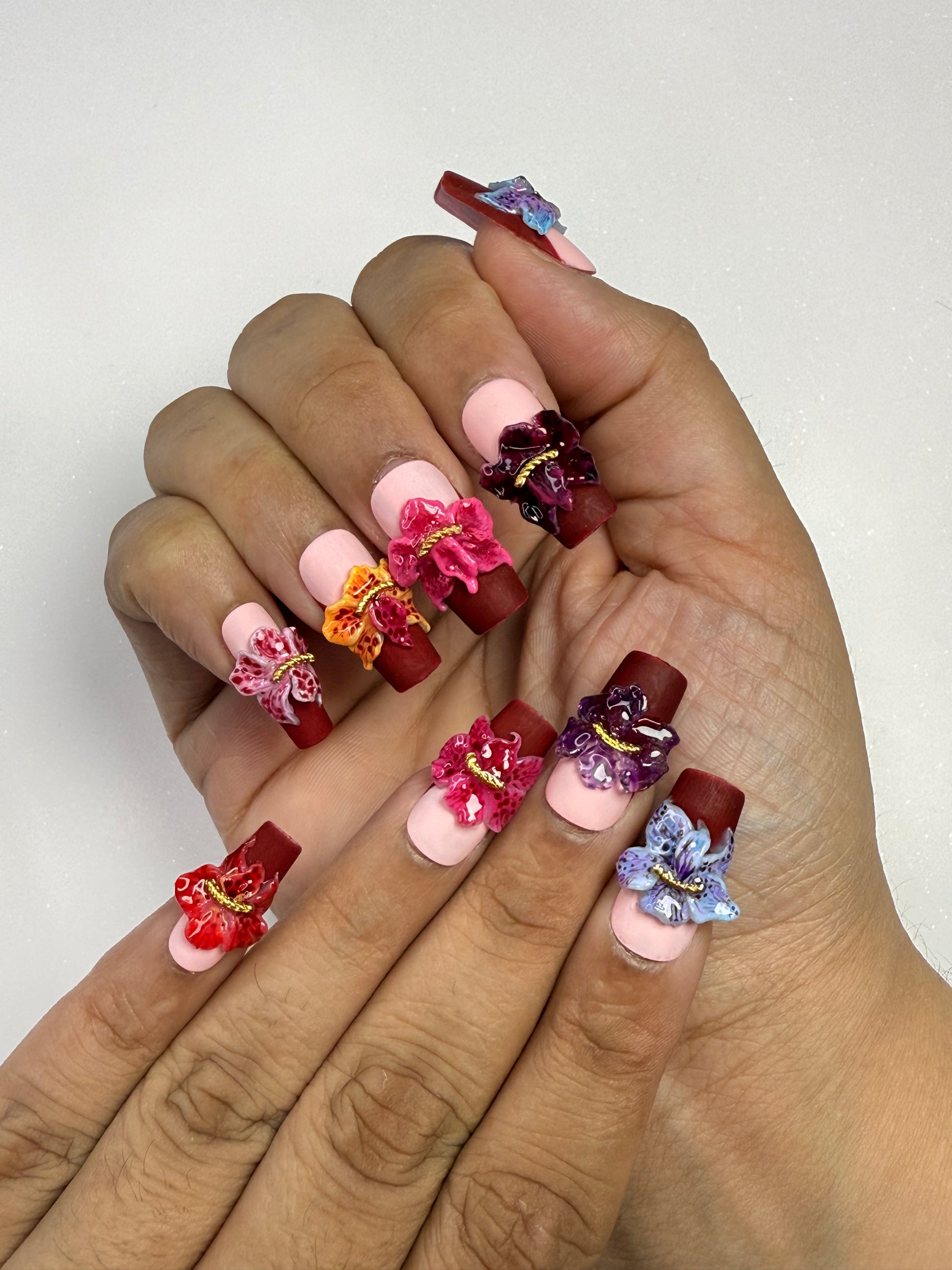 LACQUER LUXURY™️’ORCHID HAVEN’ IS A SHOWCASE OF SCULPTED ORCHID ARTISTRY. EACH SQUARE NAIL CARRIES HAND-CRAFTED 3D ORCHIDS IN VIVID TONES, ACCENTED WITH GOLDEN BEAD CENTERS FOR A JEWEL-LIKE FINISH ON A RED MATTE FINISH BASE THAT ACT AS SOFT BLUSH GRADIENT BENEATH CREATES DEPTH, ALLOWING THE FLORALS TO STAND OUT AS BOLD STATEMENT PIECES. CRAFTED AS DESIGNER PRESS-ON NAILS, ORCHID HAVEN BLENDS THE PRECISION OF HANDMADE PRESS-ON NAILS WITH COUTURE DETAIL. BUILT FOR BOTH BEAUTY AND DURABILITY, THESE PREMIUM PRESS-ON NAILS OFFER A SALON MASTERPIECE IN MINUTES. AMONG LUXURY PRESS-ON NAILS ONLINE, ORCHID HAVEN DEFINES FLORAL COUTURE AT YOUR FINGERTIPS.