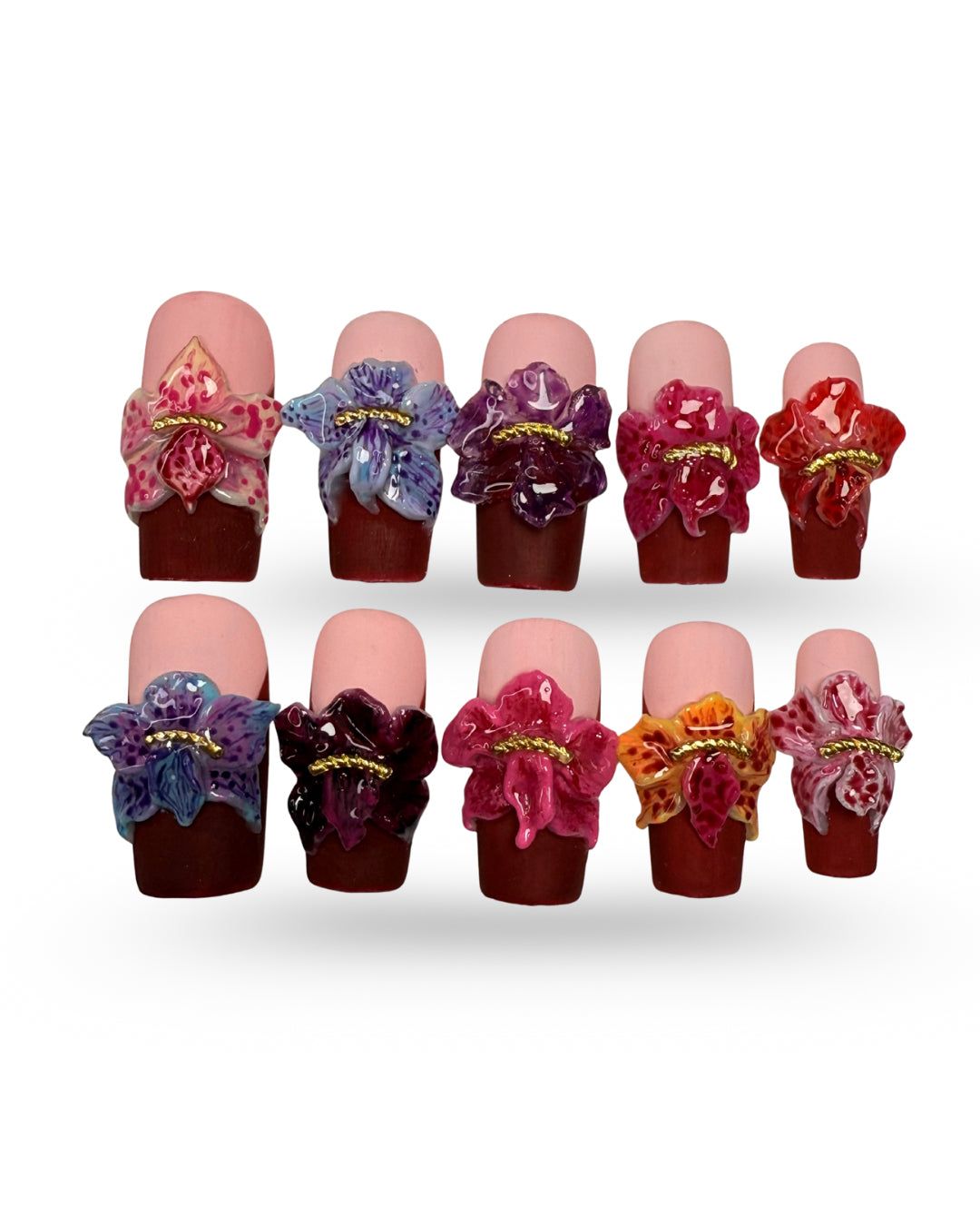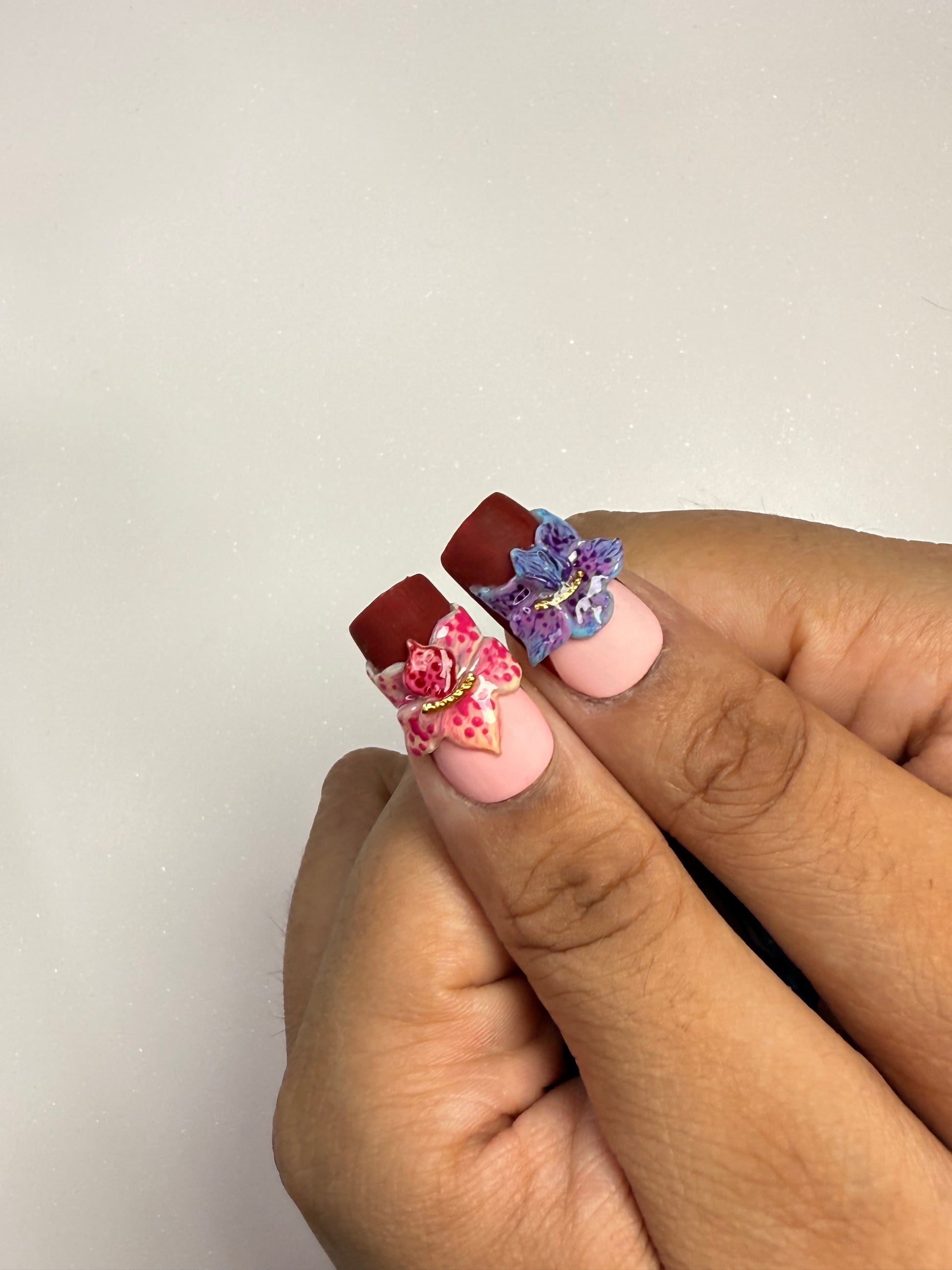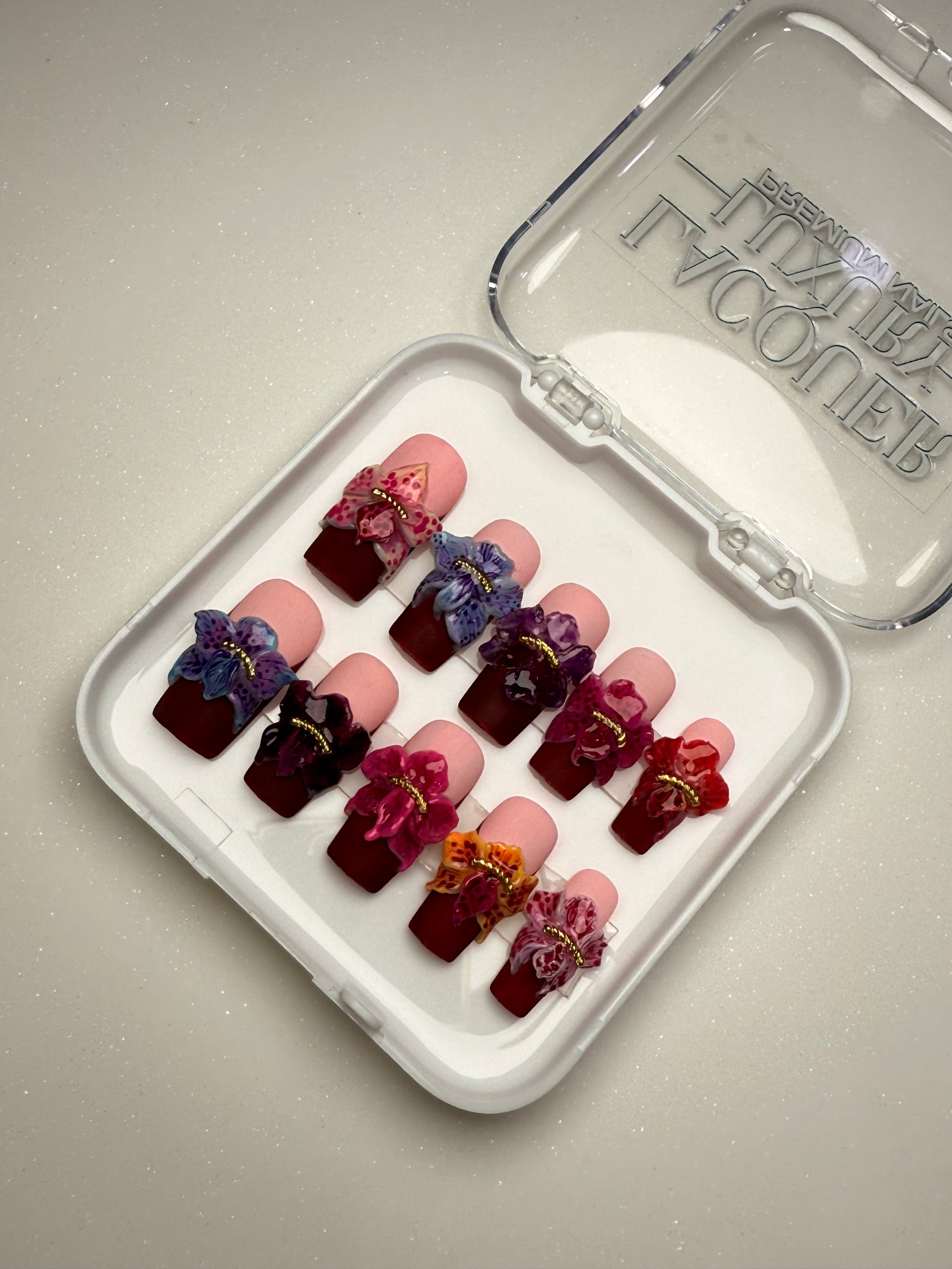 LACQUER LUXURY™️’ORCHID HAVEN’ IS A SHOWCASE OF SCULPTED ORCHID ARTISTRY. EACH SQUARE NAIL CARRIES HAND-CRAFTED 3D ORCHIDS IN VIVID TONES, ACCENTED WITH GOLDEN BEAD CENTERS FOR A JEWEL-LIKE FINISH ON A RED MATTE FINISH BASE THAT ACT AS SOFT BLUSH GRADIENT BENEATH CREATES DEPTH, ALLOWING THE FLORALS TO STAND OUT AS BOLD STATEMENT PIECES. CRAFTED AS DESIGNER PRESS-ON NAILS, ORCHID HAVEN BLENDS THE PRECISION OF HANDMADE PRESS-ON NAILS WITH COUTURE DETAIL. BUILT FOR BOTH BEAUTY AND DURABILITY, THESE PREMIUM PRESS-ON NAILS OFFER A SALON MASTERPIECE IN MINUTES. AMONG LUXURY PRESS-ON NAILS ONLINE, ORCHID HAVEN DEFINES FLORAL COUTURE AT YOUR FINGERTIPS.