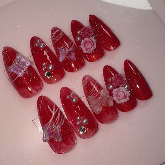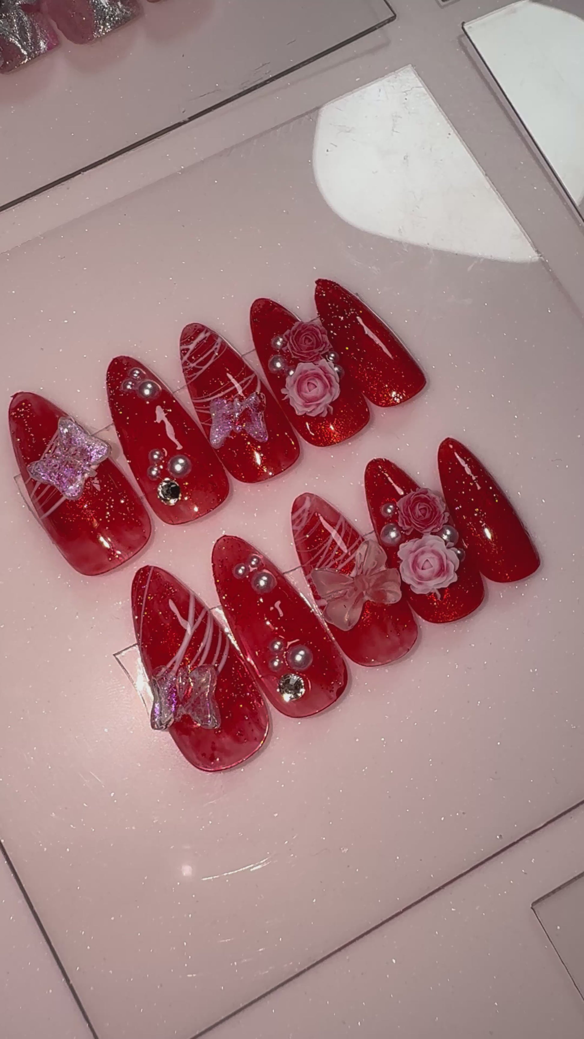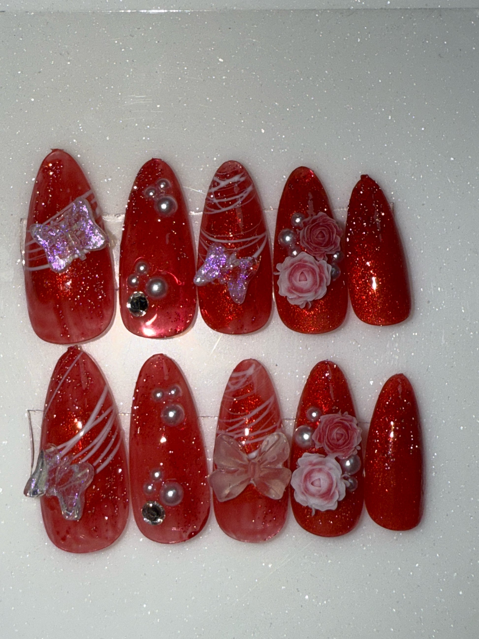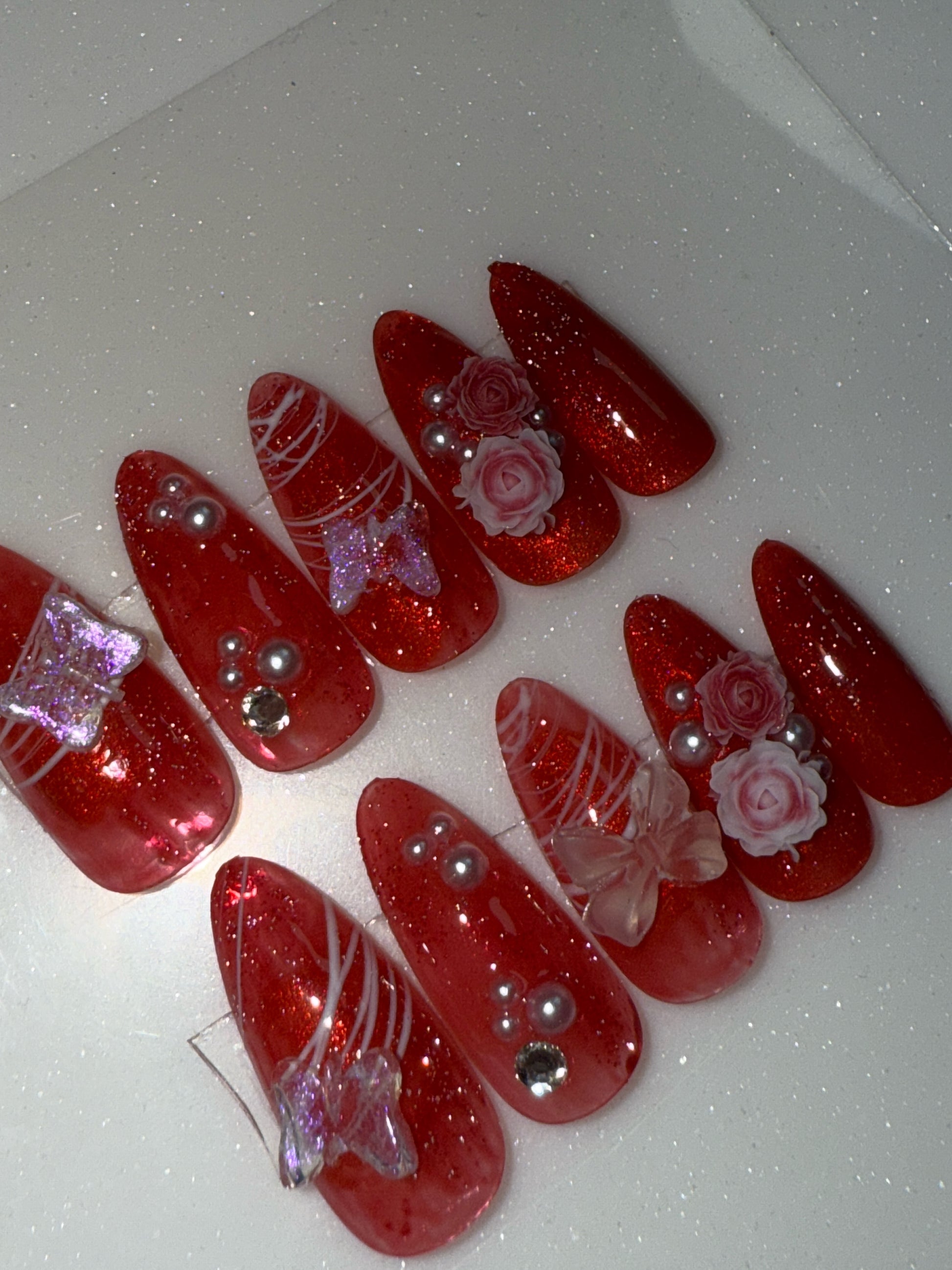 LACQUER LUXURY™ 'RED ROSE'GLOSSY CHERRY RED BASE WITH HIGH SHINE GLITTER, TOPPED WITH PEARLS, 3D FLORALS, AND BUTTERFLY CHARMS. PLAYFUL, SWEET, AND STACKED WITH TEXTURE THAT CATCHES LIGHT FROM EVERY ANGLE. THIS SET HITS THE PERFECT BALANCE BETWEEN CUTE AND BOLD.