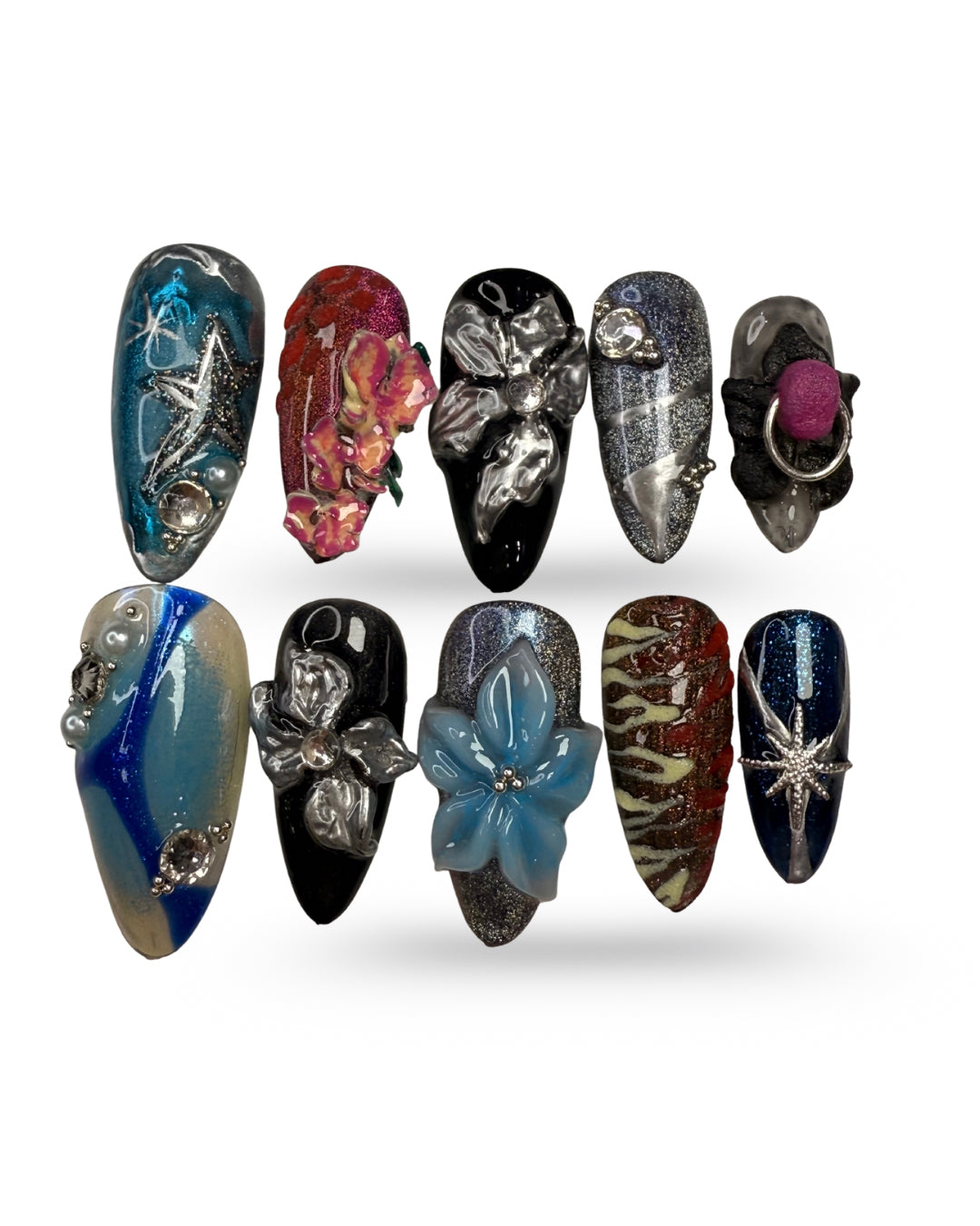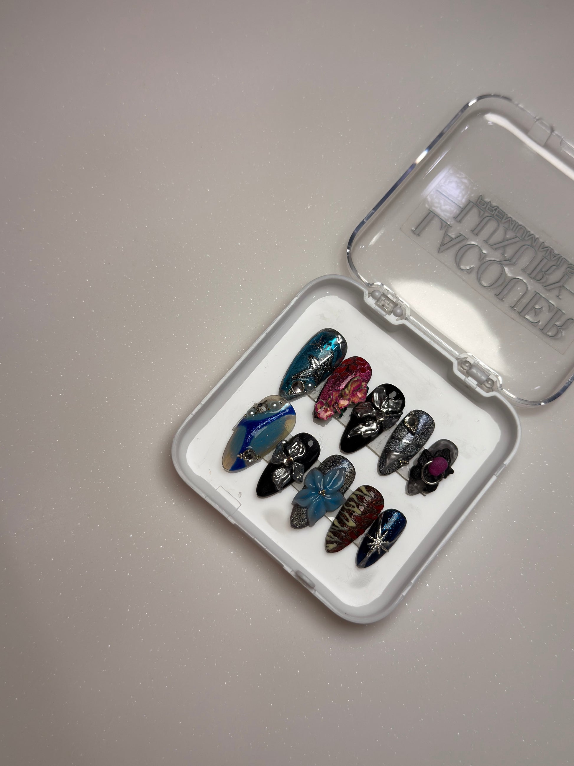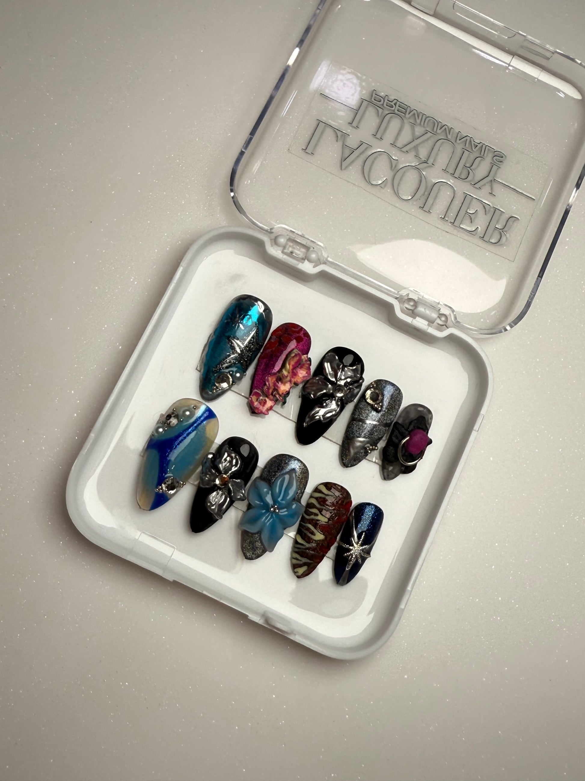 LACQUER LUXURY™️ ‘STARLIT’ BRINGS TOGETHER THE MYSTERY OF THE NIGHT SKY WITH THE EDGE OF HIGH-FASHION NAIL ART. A METALLIC TURQUOISE BASE GLIMMERS WITH A SILVER STAR AND CRYSTALS, WHILE MAGENTA SHIMMER IS LAYERED WITH ORCHID PETALS. GLOSSY BLACK NAILS CARRY BOLD CHROME FLOWERS, SILVER BASES SPARKLE WITH RHINESTONE CLUSTERS, AND GUNMETAL IS TRANSFORMED WITH A BLACK FLOWER CROWNED BY A PURPLE GEM AND RING ACCENT. BLUE GRADIENTS SOFTEN INTO PEARL AND CRYSTAL DETAILS, GREY SHIMMER GLOWS BENEATH A TRANSLUCENT BLUE BLOOM, AND DEEP RED NAILS ARE STREAKED WITH ANIMAL-INSPIRED GOLD. THE SET FINISHES WITH MIDNIGHT NAVY, LIT UP BY A RADIANT SILVER STARBURST. EVERY DETAIL IN STARLIT IS HANDCRAFTED, MAKING IT MORE THAN JUST DESIGNER PRESS-ON NAILS — IT’S WEARABLE ART THAT BLENDS THE DRAMA OF CELESTIAL NIGHTS WITH THE CREATIVITY OF HANDMADE PRESS-ON NAILS, ALL IN THE LASTING QUALITY OF PREMIUM PRESS-ON NAILS.