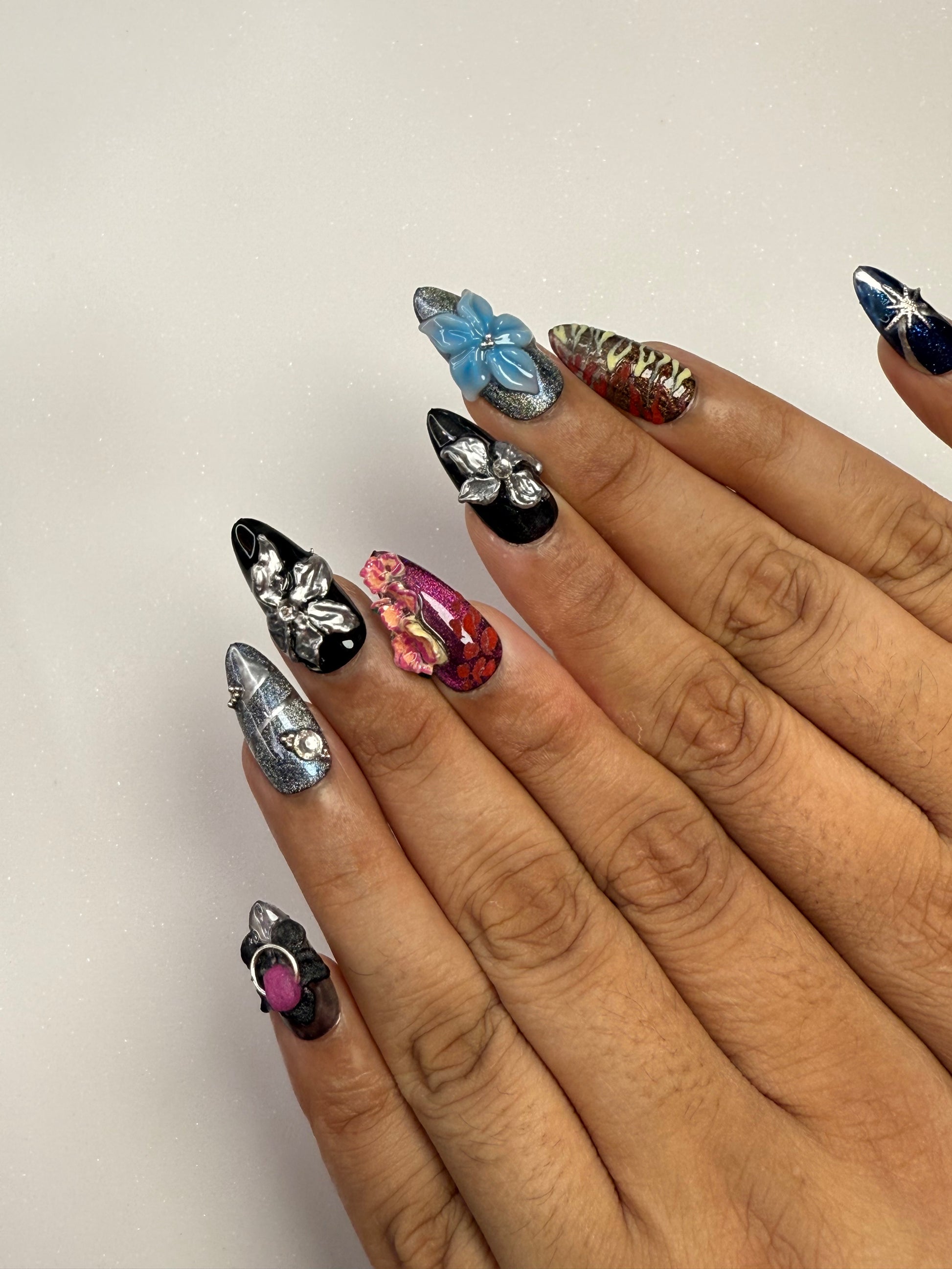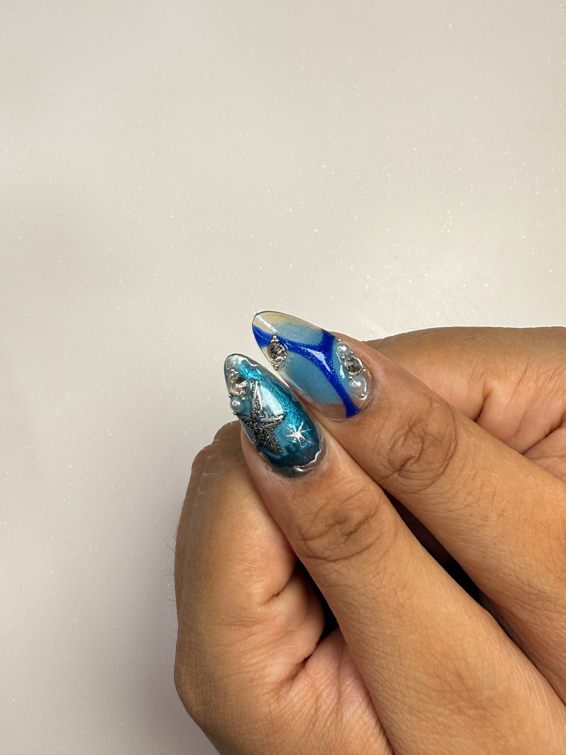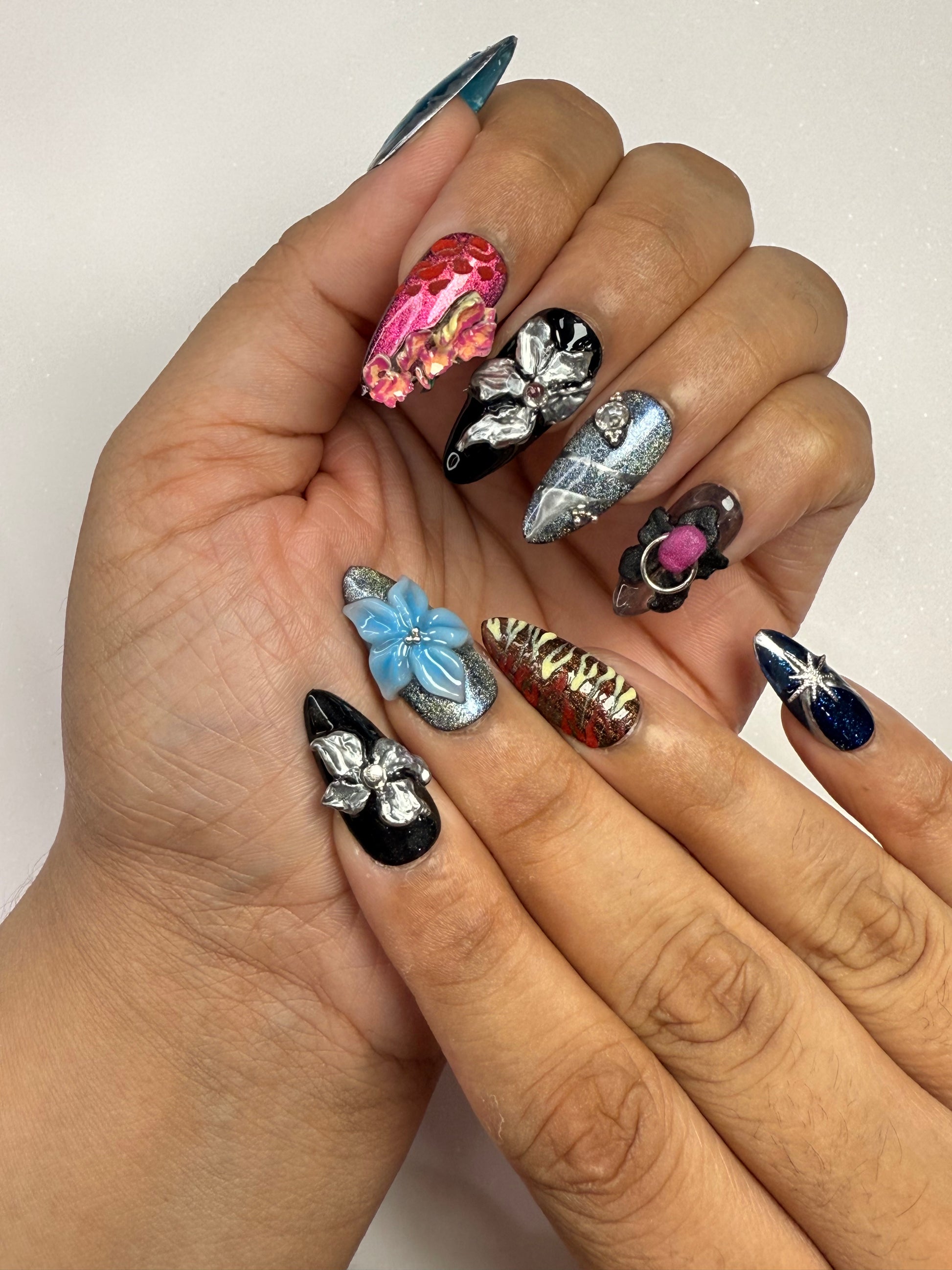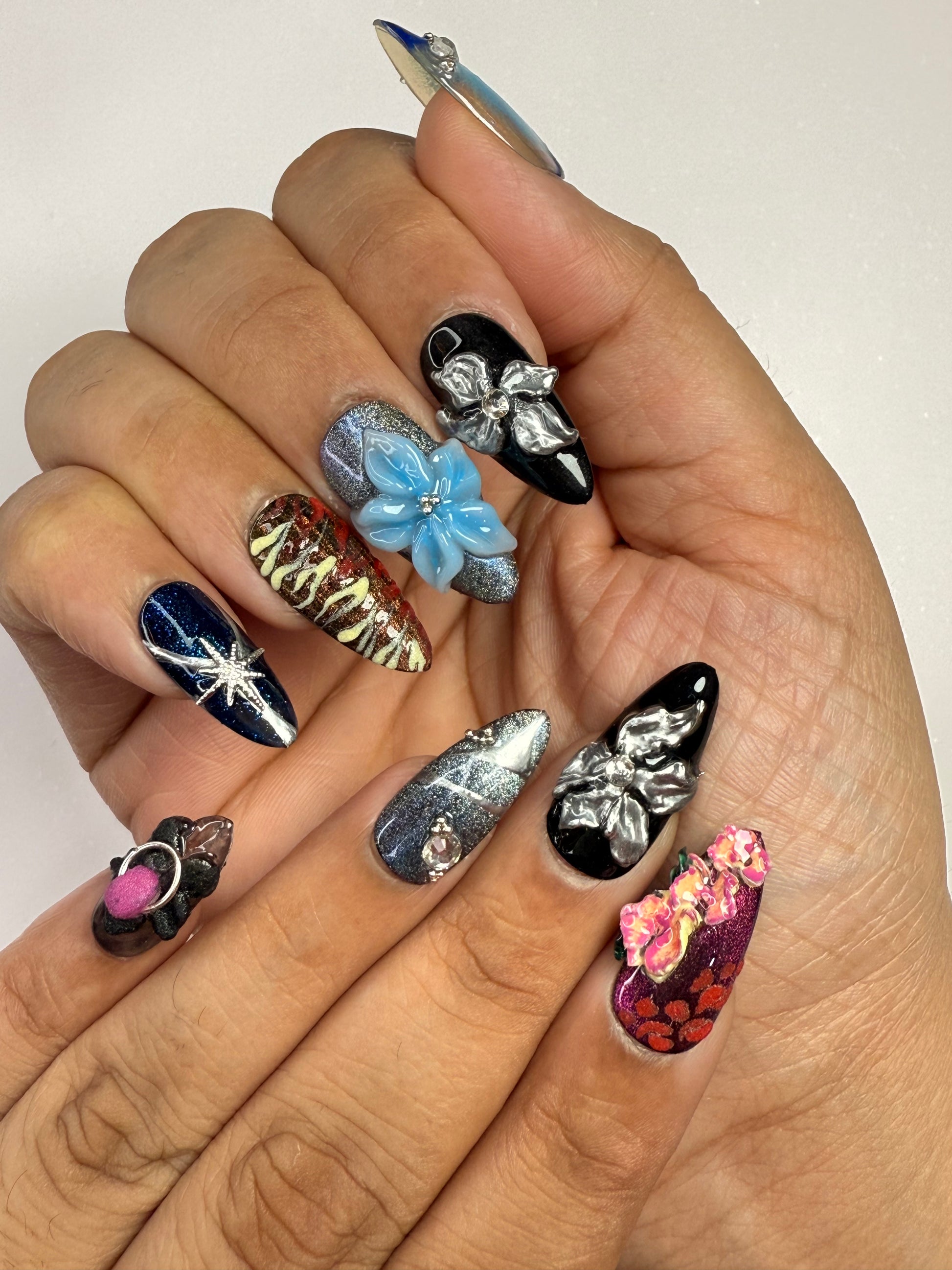 LACQUER LUXURY™️ ‘STARLIT’ BRINGS TOGETHER THE MYSTERY OF THE NIGHT SKY WITH THE EDGE OF HIGH-FASHION NAIL ART. A METALLIC TURQUOISE BASE GLIMMERS WITH A SILVER STAR AND CRYSTALS, WHILE MAGENTA SHIMMER IS LAYERED WITH ORCHID PETALS. GLOSSY BLACK NAILS CARRY BOLD CHROME FLOWERS, SILVER BASES SPARKLE WITH RHINESTONE CLUSTERS, AND GUNMETAL IS TRANSFORMED WITH A BLACK FLOWER CROWNED BY A PURPLE GEM AND RING ACCENT. BLUE GRADIENTS SOFTEN INTO PEARL AND CRYSTAL DETAILS, GREY SHIMMER GLOWS BENEATH A TRANSLUCENT BLUE BLOOM, AND DEEP RED NAILS ARE STREAKED WITH ANIMAL-INSPIRED GOLD. THE SET FINISHES WITH MIDNIGHT NAVY, LIT UP BY A RADIANT SILVER STARBURST. EVERY DETAIL IN STARLIT IS HANDCRAFTED, MAKING IT MORE THAN JUST DESIGNER PRESS-ON NAILS — IT’S WEARABLE ART THAT BLENDS THE DRAMA OF CELESTIAL NIGHTS WITH THE CREATIVITY OF HANDMADE PRESS-ON NAILS, ALL IN THE LASTING QUALITY OF PREMIUM PRESS-ON NAILS.