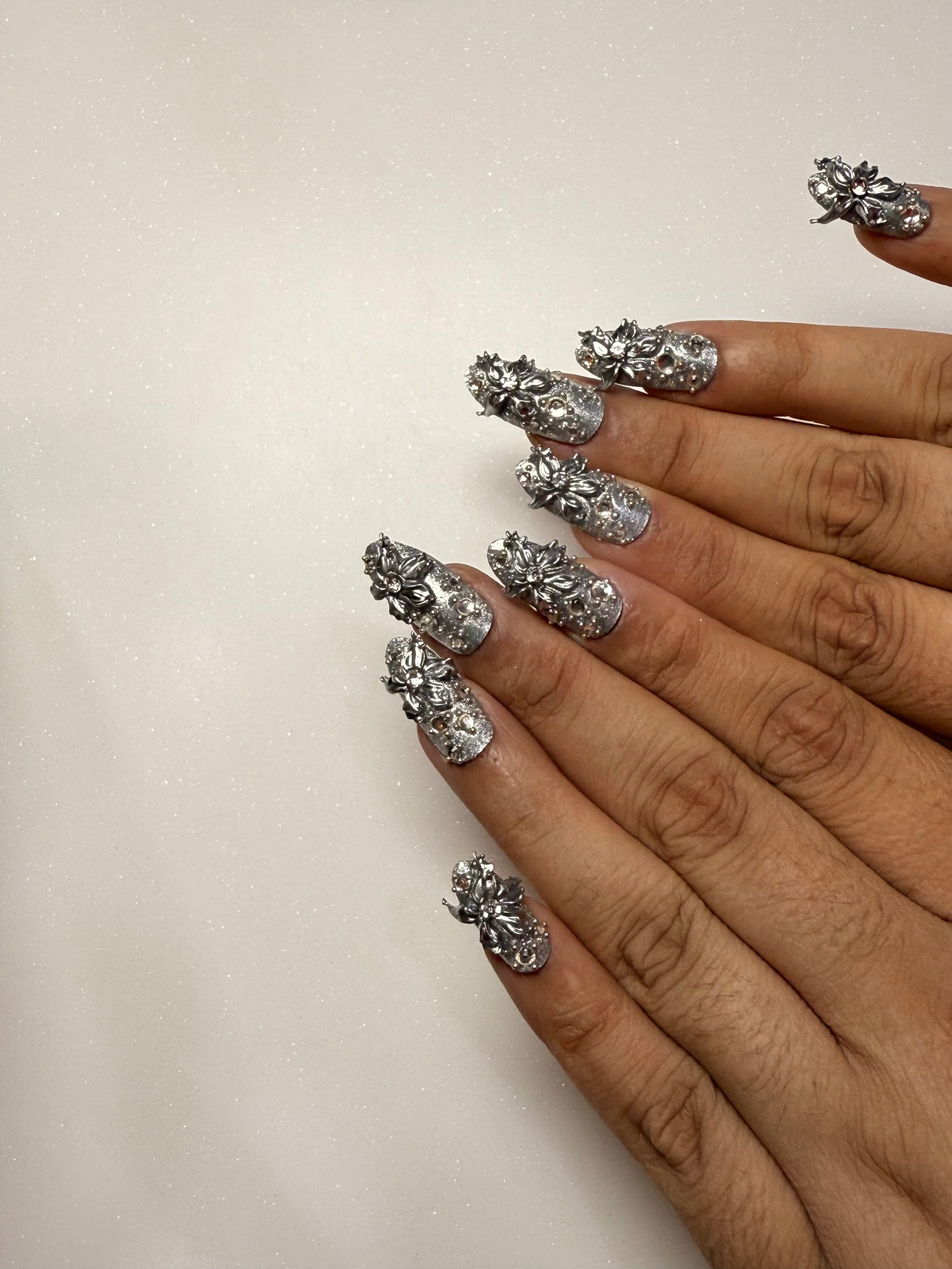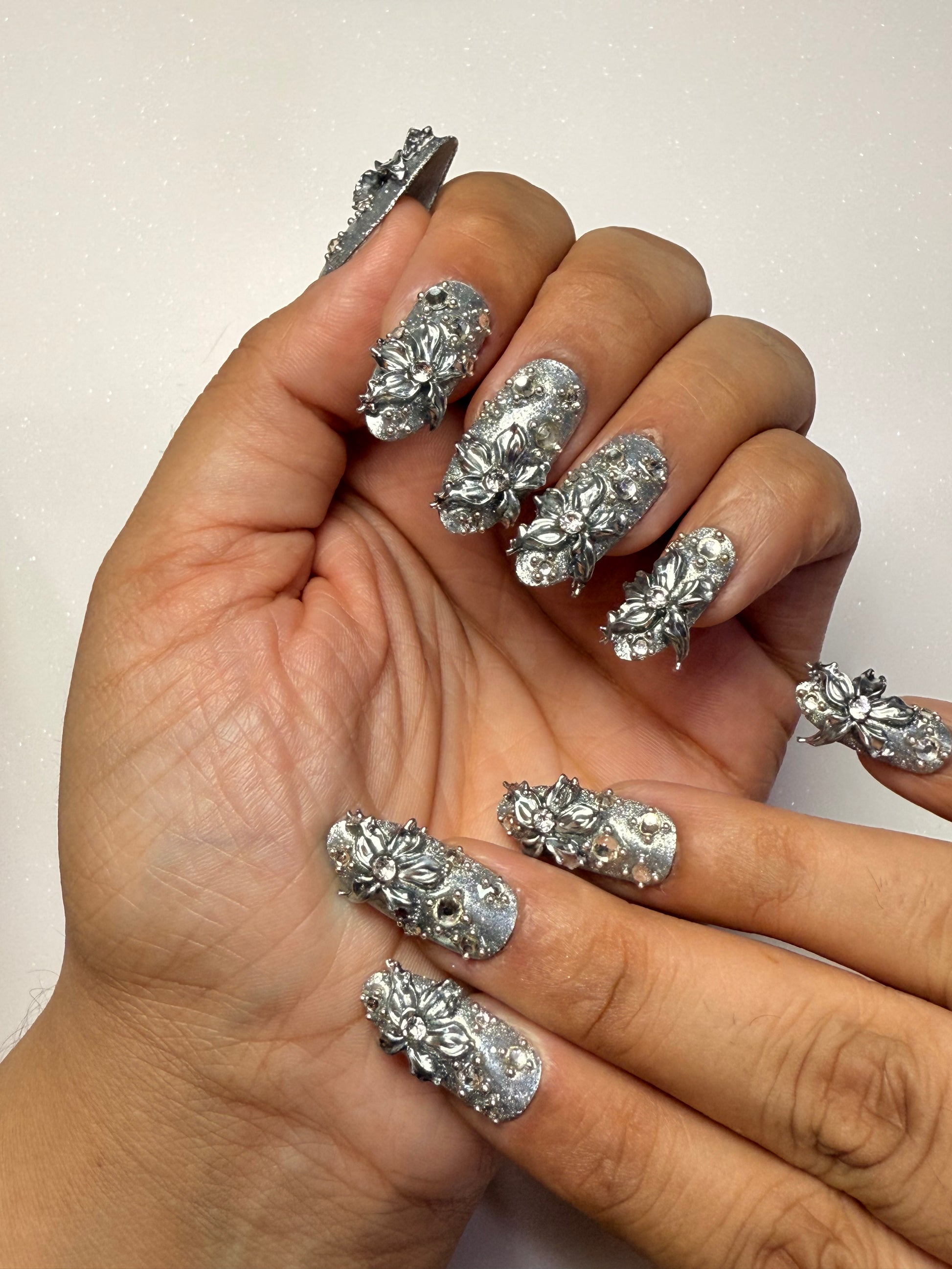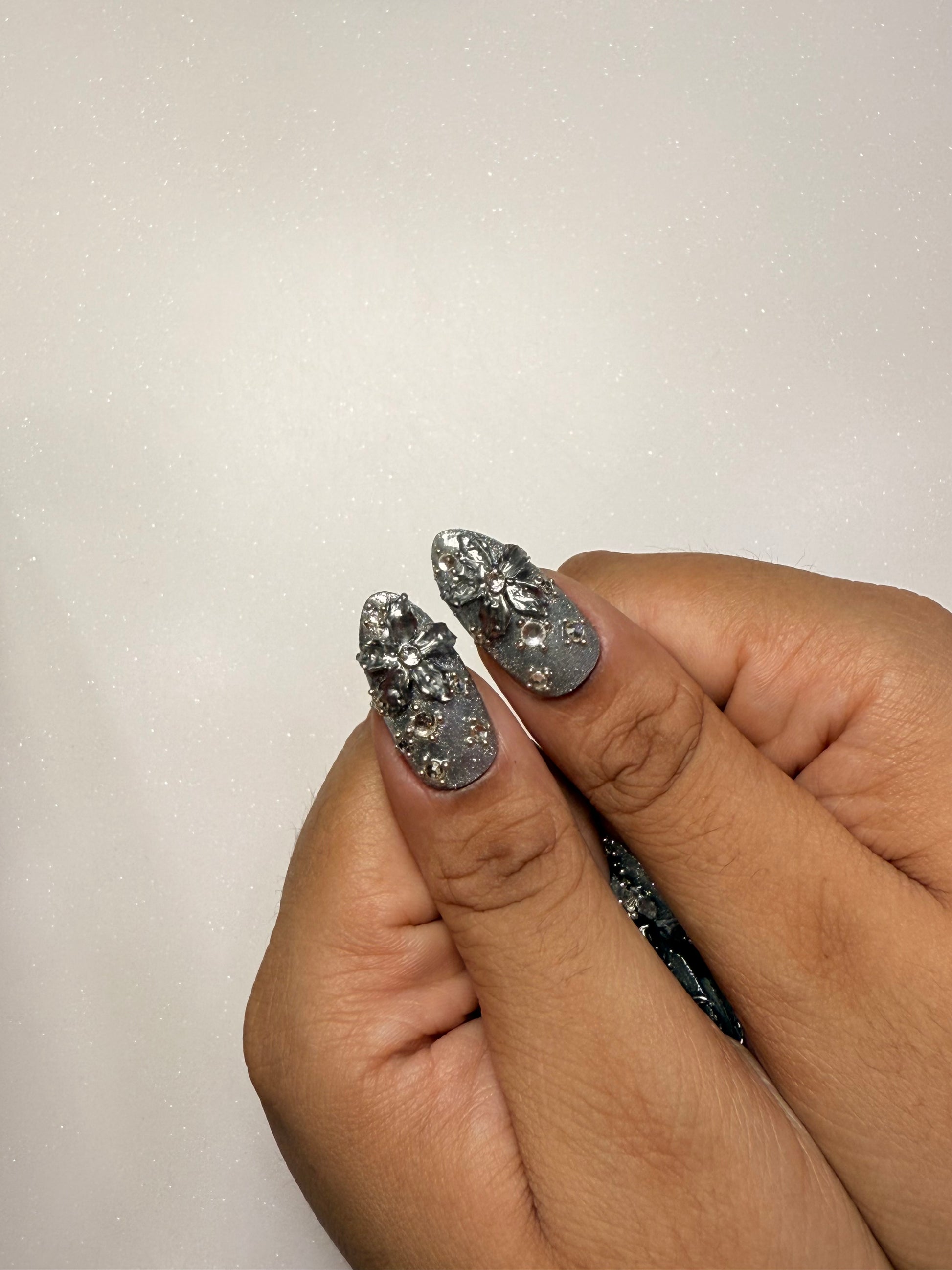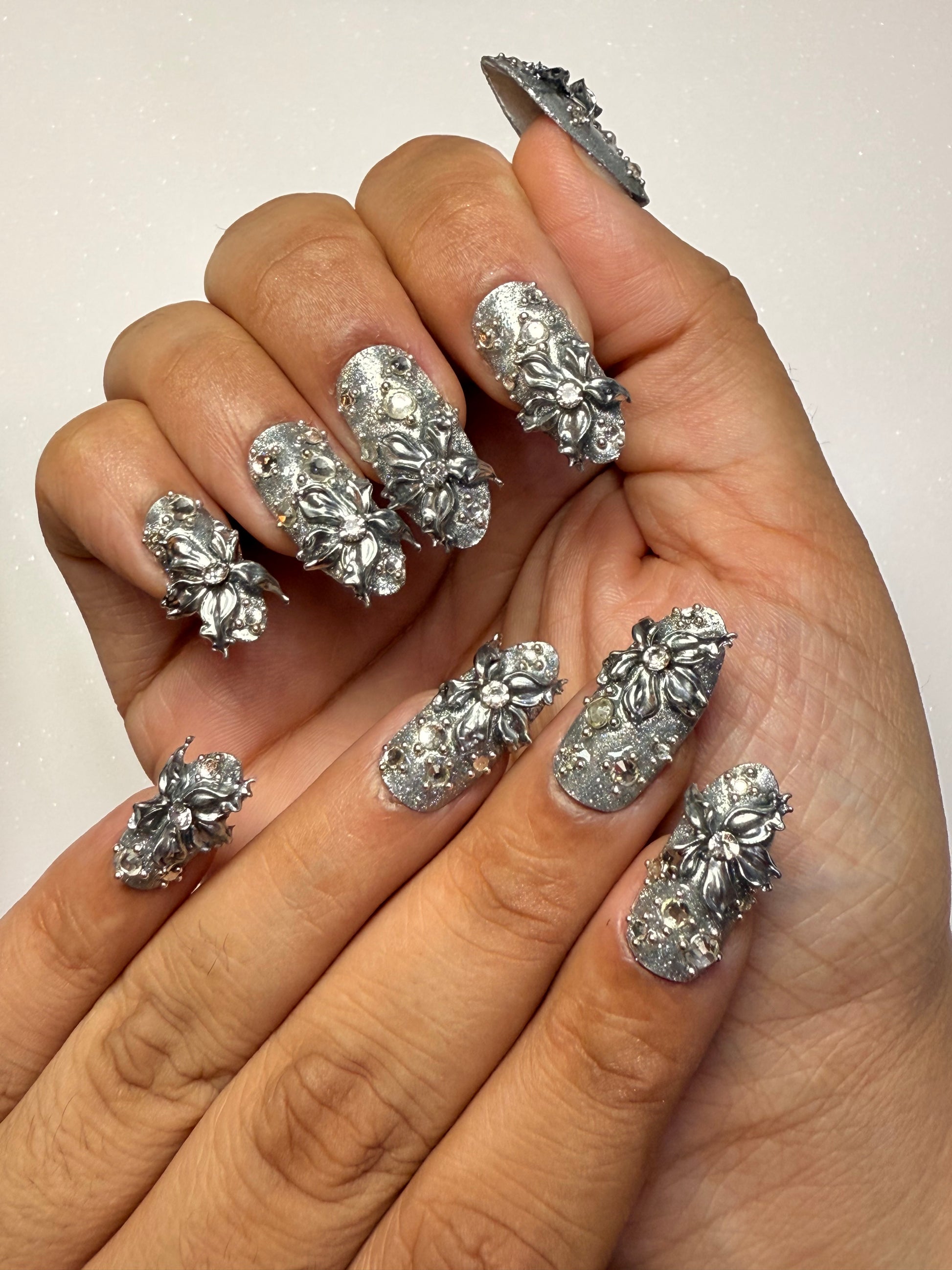 LACQUER LUXURY™️‘TITAN ROSE’ CAPTURES THE DUALITY OF POWER AND GRACE A FUSION OF METALLIC STRENGTH AND SCULPTED FLORAL ARTISTRY. DESIGNED IN DEEP GRAPHITE AND SILVER TONES, EACH NAIL IS BUILT LIKE ARMOR YET SOFTENED BY THE INTRICATE BLOOM OF 3D FLOWERS. THE REFLECTIVE CHROME FINISH AND CRYSTAL DETAILING CREATE A REFINED PLAY OF TEXTURE AND LIGHT, GIVING THE ILLUSION OF MOLTEN PETALS FORGED IN METAL. CRAFTED AS LUXURY PRESS-ON NAILS, THIS SET BRINGS TOGETHER THE PRECISION OF HANDMADE NAIL ART AND THE DURABILITY OF PREMIUM DESIGNER NAILS. PERFECT FOR THOSE WHO SEE NAILS AS MORE THAN BEAUTY TITAN ROSE STANDS AS A STATEMENT OF CRAFTSMANSHIP AND INDIVIDUALITY, AMONG THE MOST LUXURIOUS PRESS-ON NAILS ONLINE.
