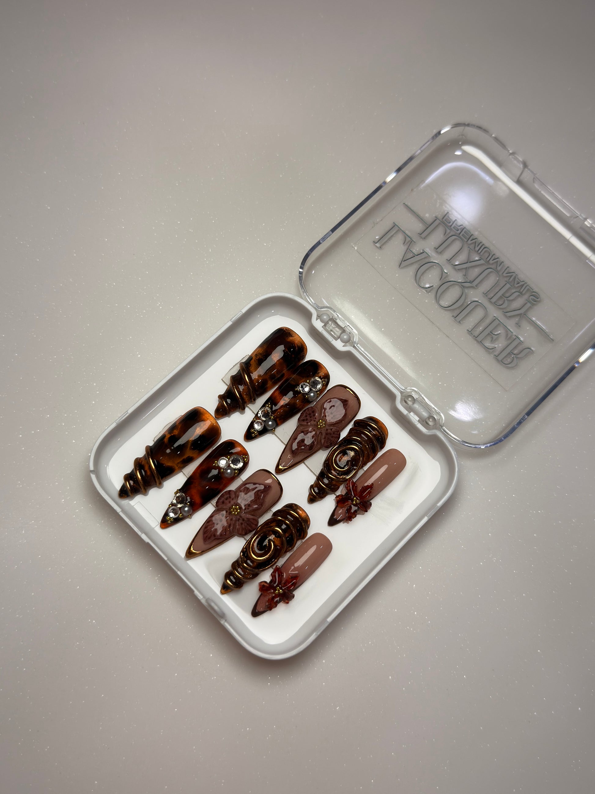 LACQUER LUXURY™️’TORTOISESHELL FLORA LEGACY’ SET IS A STRIKING HARMONY OF DEEP TORTOISESHELL PATTERNS, SCULPTED SPIRALS, AND INTRICATE FLORAL ARTISTRY. EACH NAIL IS FINISHED WITH CRYSTAL AND PEARL EMBELLISHMENTS, CREATING A COUTURE AESTHETIC THAT FEELS BOTH BOLD AND REFINED. CRAFTED AS DESIGNER PRESS-ON NAILS, THIS COLLECTION HIGHLIGHTS THE PRECISION OF HANDMADE PRESS-ON NAILS WITH THE SOPHISTICATION OF TIMELESS LUXURY. MORE THAN ACCESSORIES, THESE ARE PREMIUM PRESS-ON NAILS DESIGNED FOR COMFORT, DURABILITY, AND EFFORTLESS APPLICATION. IDEAL FOR DISCERNING CLIENTS WHO SEEK LUXURY PRESS-ON NAILS ONLINE, THE TORTOISESHELL FLORA LEGACY REDEFINES NAIL ARTISTRY—TRANSFORMING EVERY GESTURE INTO A MARK OF DISTINCTION.