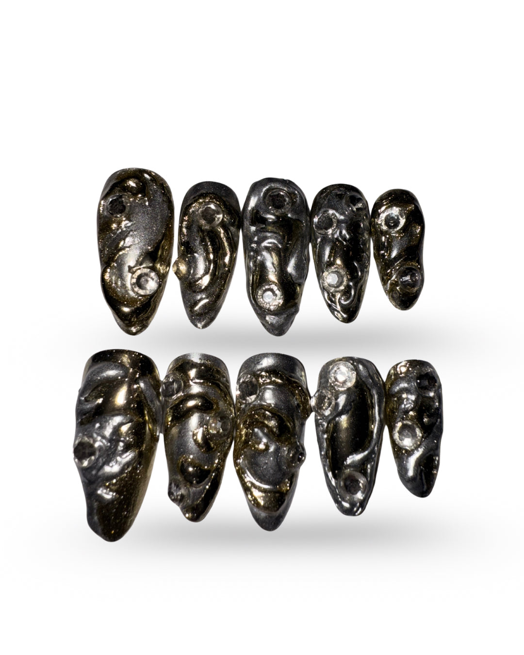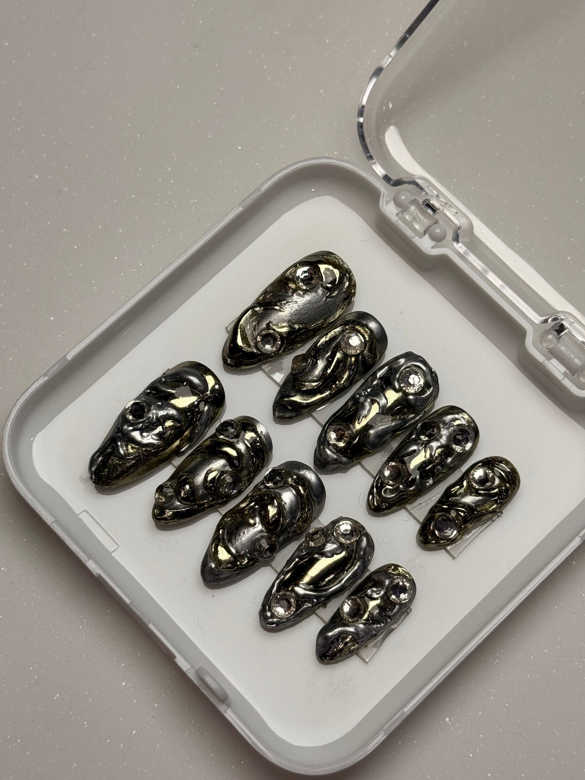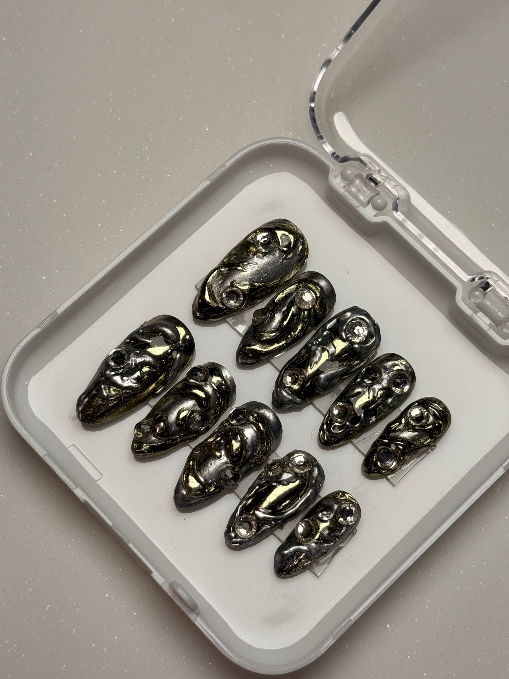 LACQUER LUXURY™️‘DUALITY OF CHROME’ EMBODIES THE CONTRAST WHERE LIGHT MEETS LIQUID METAL. THIS DESIGN MERGES MOLTEN SILVER AND SOFT GOLD CHROME, CREATING A SCULPTURAL FINISH THAT SHIFTS BEAUTIFULLY WITH EVERY MOVEMENT. EACH NAIL CARRIES A SENSE OF DEPTH AND FLUIDITY, WHERE METALLIC TONES MELT INTO ONE ANOTHER WITH DELIBERATE ARTISTRY. BUILT AS LUXURY PRESS-ON NAILS, THE SET CAPTURES THE ALLURE OF CONTRAST, COOL AND WARM, BOLD AND REFINED. THE SEAMLESS BLEND OF SILVER AND GOLD MIRRORS THE DUAL NATURE OF MODERN FEMININITY: POWERFUL YET POISED. EVERY DETAIL IN DUALITY OF CHROME SPEAKS TO PRECISION AND POLISH, FROM THE MIRROR-GLOSS FINISH TO THE INTRICATE HAND-LAYERED FORM. THIS IS MORE THAN NAIL ART IT’S A WEARABLE STATEMENT OF CRAFTSMANSHIP, BALANCE, AND QUIET EXTRAVAGANCE. AMONG DESIGNER PRESS-ON NAILS, DUALITY OF CHROME DEFINES THE NEW ERA OF METALLIC COUTURE FLUID, COMMANDING, AND TIMELESSLY LUMINOUS.